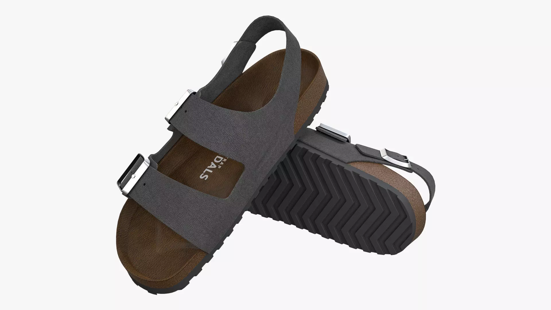 Detailed 3D model of a pair of grey leather backstrap sandals, modeled in Cinema 4D and rendered with V-Ray 5. The model was created using approximate real world dimensions.