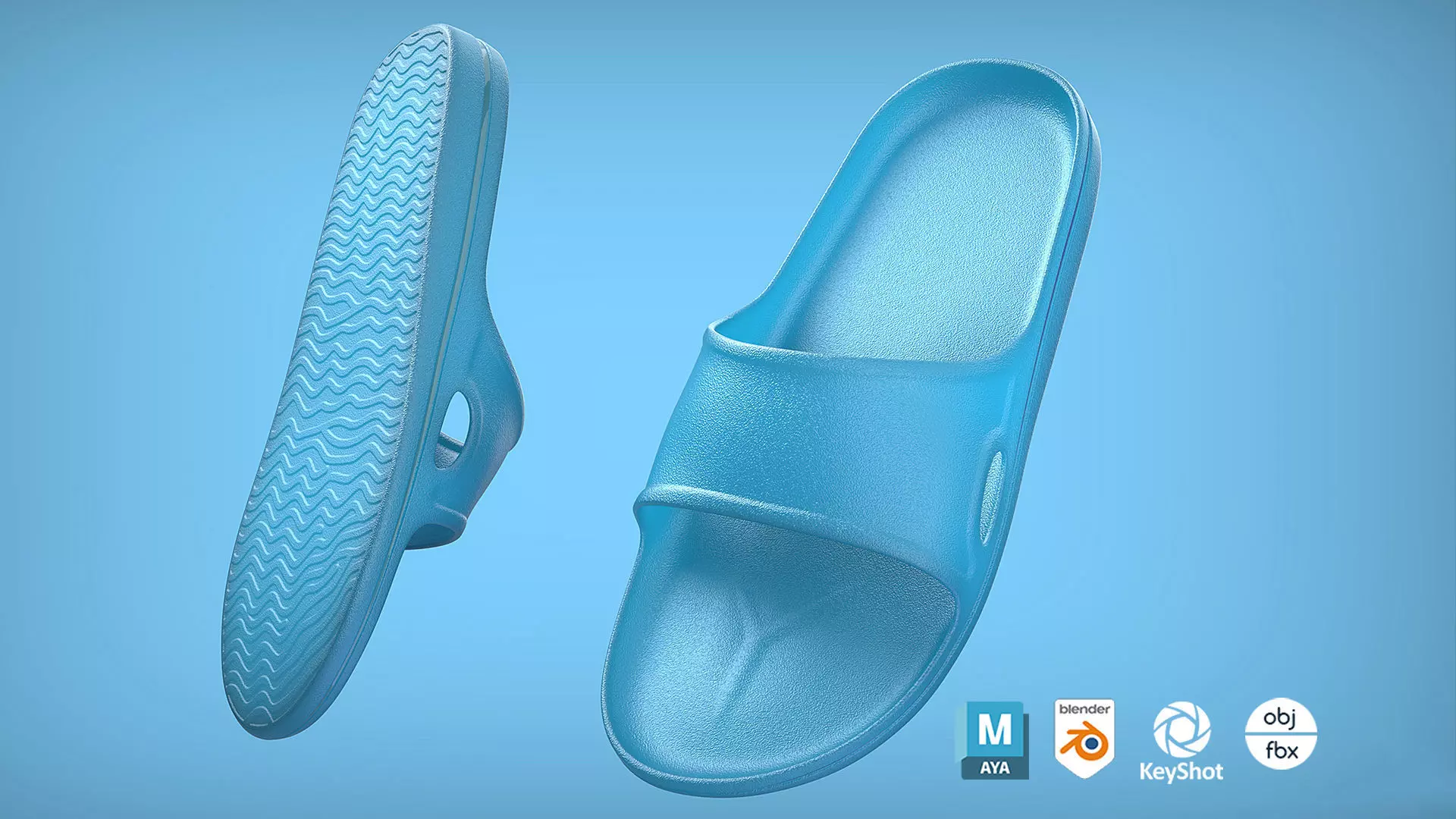 Highly detailed Slide Style, Unisex, Sandals. See rendering preview examples for Maya, Blender, and Keyshot - no postwork editing. See shader node set-up to help you in other programs.Non branded and unique design. All surfaces UV mapped to 1:1 square (usually 6K textures). Maya, Blender, and Keyshot files use Subsurface Scattering to create a slightly translucent plastic material