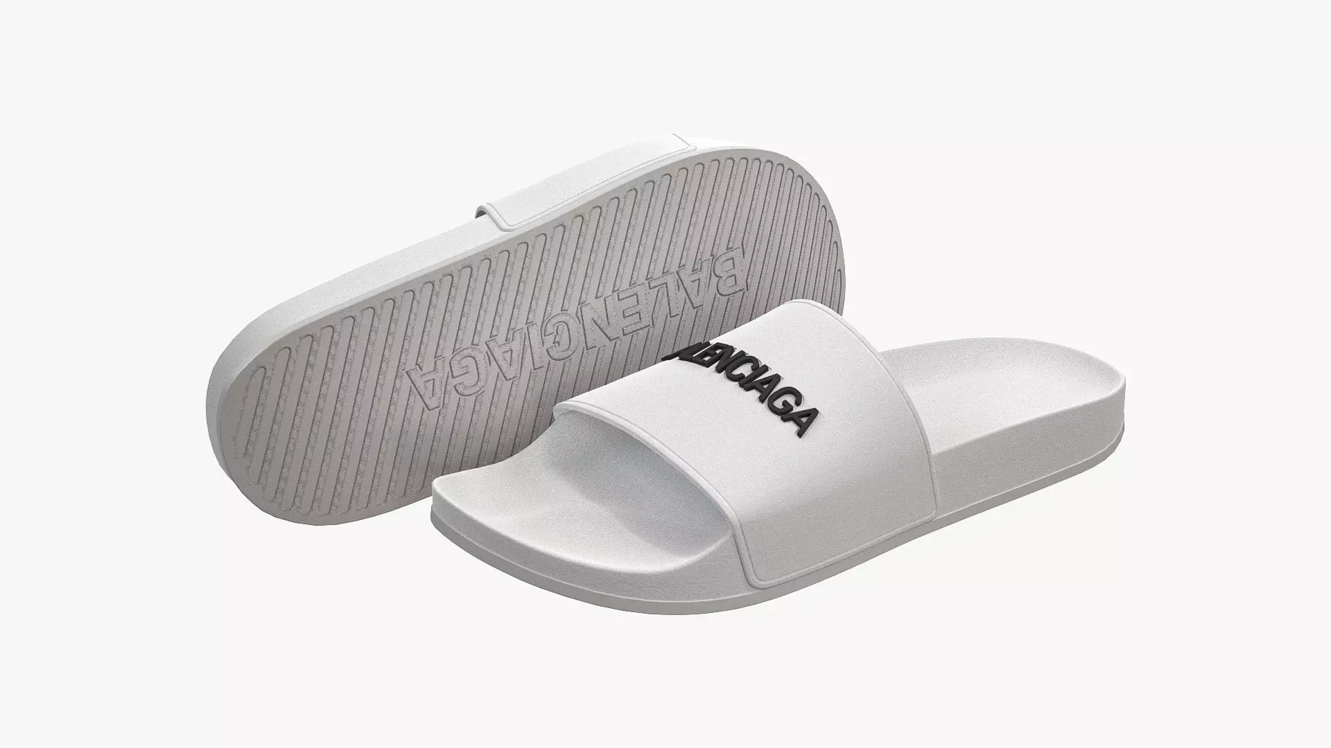 Detailed 3D model of a pair of Balenciaga Slide Sandals in White, modeled in Cinema 4D and rendered with V-Ray 5. The model was created using approximate real world dimensions.