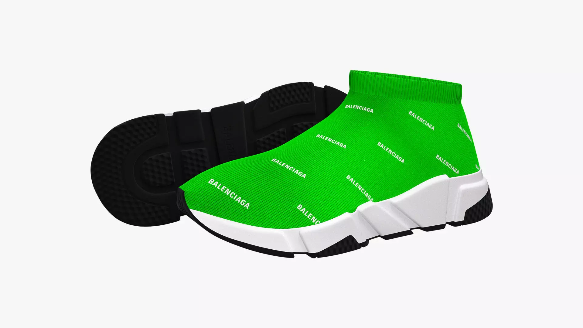 Detailed 3D model of a pair of Green Balenciaga Speed Trainers Low, modeled in Cinema 4D and rendered with V-Ray 5. The model was created using approximate real world dimensions.