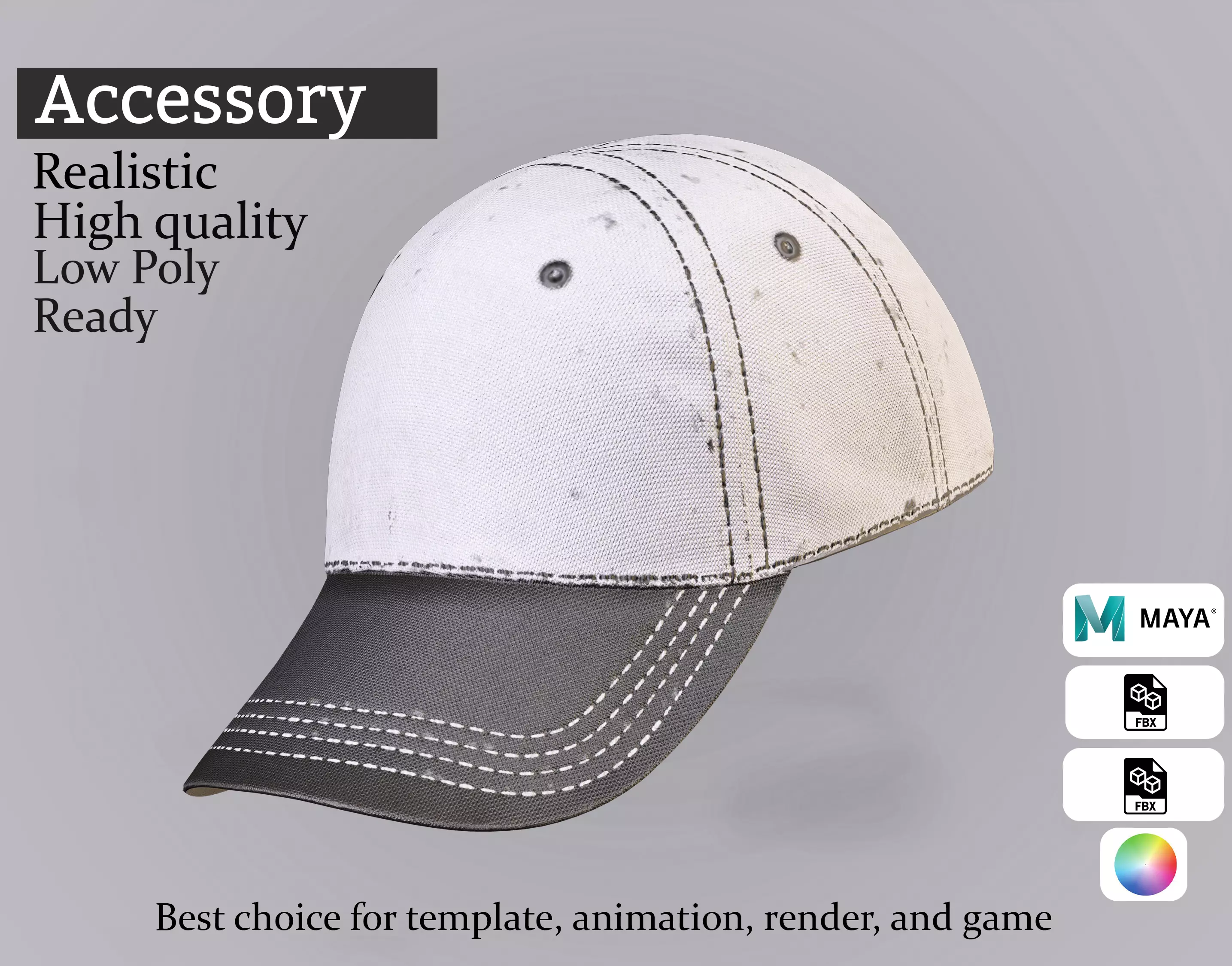 This high-quality 3D baseball cap is the perfect accessory for casual or urban-style characters in games, cinematics, or AR/VR applications. Designed with realistic stitched seams, fabric detail, and subtle wear, this two-tone hat (white cap with black bill) gives a grounded, lifelike appearance.