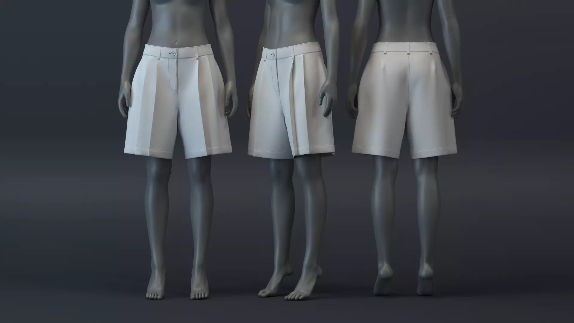 DESIGN DETAILS• Main Fabric: Twill (VMOD Library)• Silhouette: Bermuda• Length: Above knee• No pockets; Pleated front detail• Waistband with button closure and faux zip-fly; 5x belt loops• Finish: Facing & Stitches included for a more realistic look when rendered