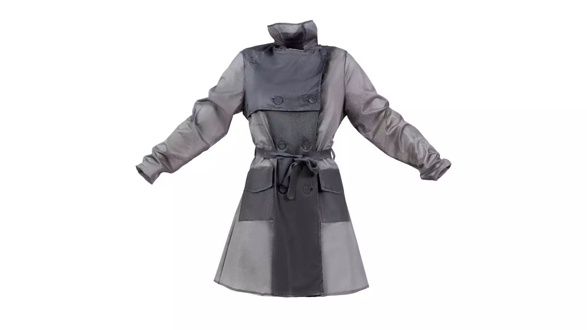 3D scanned model featuring a women's trench coat with a black and gray color scheme. This model, black transparant vinyl raincoat closed, has been created using photogrammetry from a real world object.The raw scan data has been cleaned, retopologized and UV-unwrapped using Zbrush. The result is a low poly mesh with baked maps. The .obj and .mtl are configured so that maps will load automatically in the shader (tested in Blender). In addition, a Blender scene is provided with the model and shader already set up for rendering and export. Detailed information below: