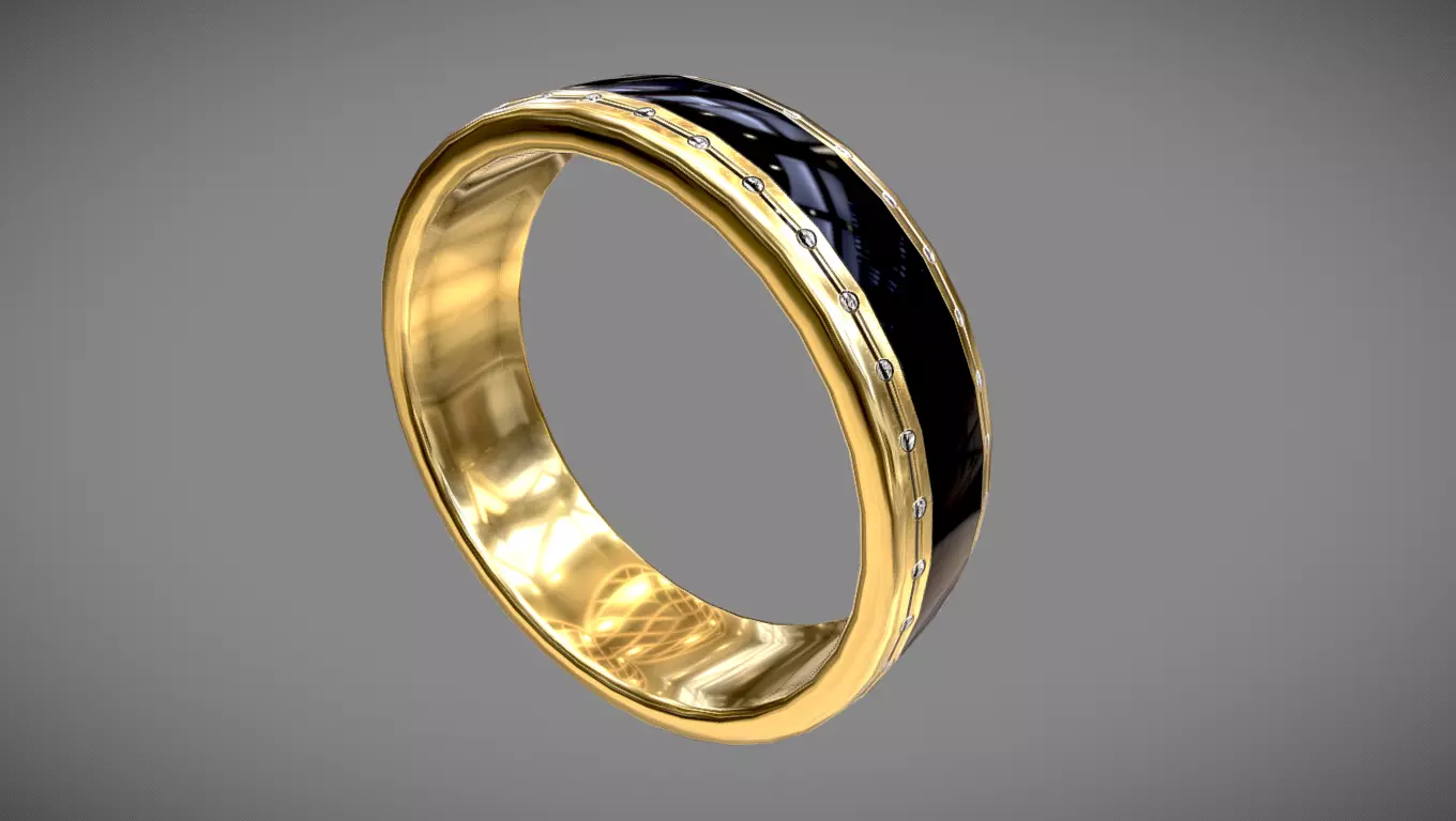 Gold ring with black jewel stripe, surrounded with small diamond stones. The model is low-poly, great to be used as a collectible, souvenir or source of power and skills in RPG games, and can also be used as a small decoration in scenario renders.