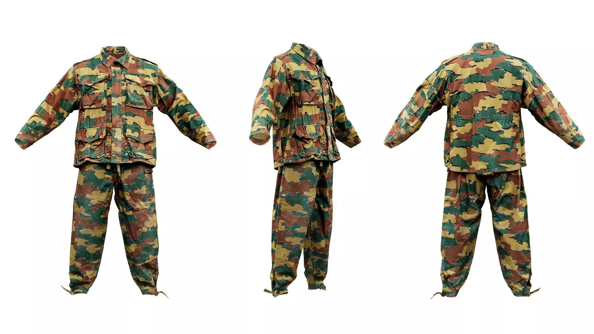 Scanned using photogrammetry this model, Camouflage Full makes for fine photorealistic shape and detail. The famous Belgian costume designer, Huis Baeyens, designed the original clothing. They granted Polygonal Miniatures permission for scanning and selling part of their catalog, which consists of roughly 100.000 costumes.
