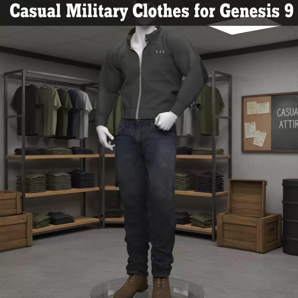 Casual Military Outfit for Genesis 9This product provides a complete Casual Military Outfit for your Genesis 9 figure. The bundle includes a jacket, jeans, and a pair of boots, perfect for creating dynamic, street-style, or tactical-themed renders. The jacket features distinct SAS and Marine symbols, adding to its authentic look.