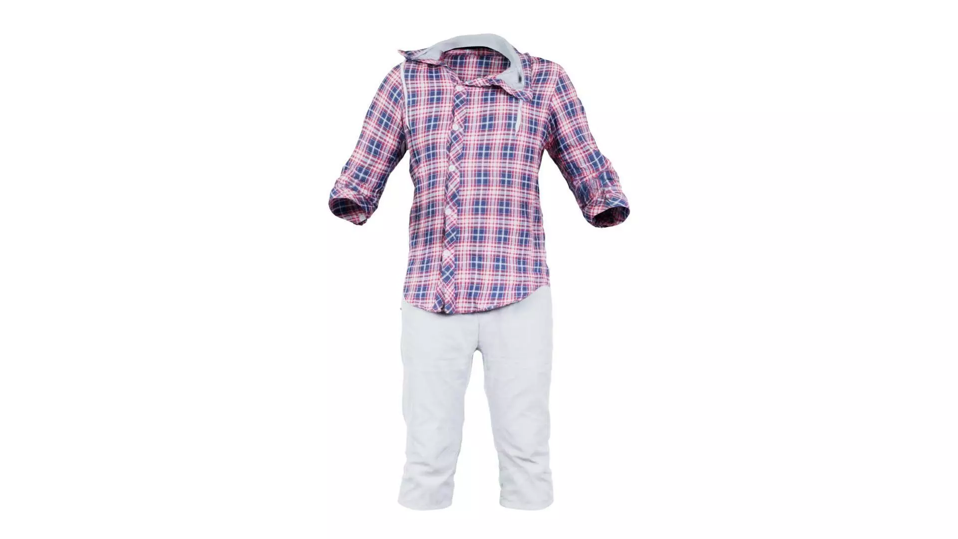 3D scanned model featuring a pink and white plaid shirt and pants. This model, casual outfit 58, has been created using photogrammetry from a real world object.The raw scan data has been cleaned, retopologized and UV-unwrapped using Zbrush. The result is a low poly mesh with baked maps. The .obj and .mtl are configured so that maps will load automatically in the shader (tested in Blender). In addition, a Blender scene is provided with the model and shader already set up for rendering and export. Detailed information below: