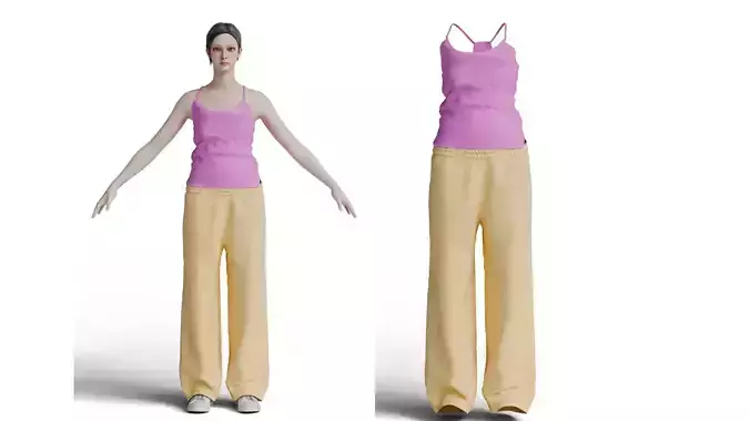 High-quality casual female outfit 3D clothing model featuring a stylish spaghetti strap tank top paired with relaxed loose-fit pants. Designed using CLO3D with realistic fabric simulation to achieve natural folds and accurate garment behavior. Optimized for Blender workflows with clean topology and proper UV mapping, making it ideal for digital fashion visualization, character design, animation, gaming projects, and virtual avatars.