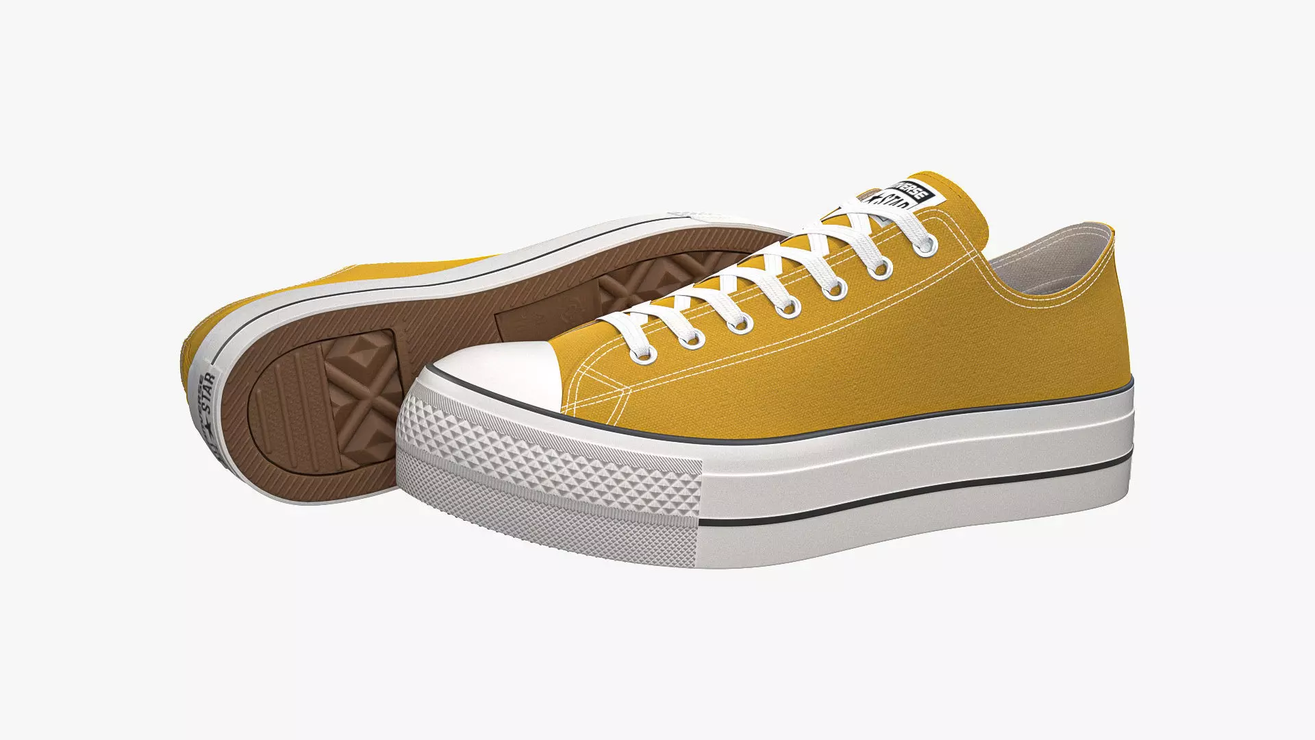 Detailed 3D model of a pair of Yellow Chuck Taylor All Star Lift Platform Low Top sneakers, modeled in Cinema 4D and rendered with V-Ray 5. The model was created using approximate real world dimensions.