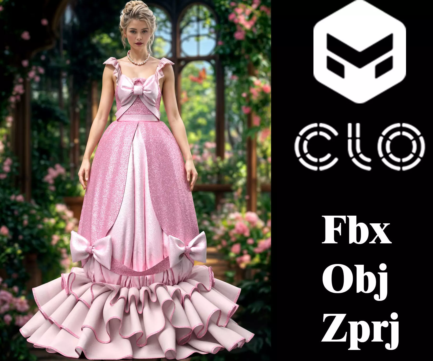 Design Inspiration:Inspired by the timeless story of Cinderella, this dress is reimagined with a dreamy pink palette, shimmering glitter textures, and luxurious volume. The silhouette features a delicately structured bodice adorned with an oversized satin bow, ruffled shoulder straps, and a voluminous layered skirt with soft, cascading waves. Every detail—from the blush sparkle to the triple bow accents—evokes a sense of dreamy nostalgia and princess-worthy glamour.