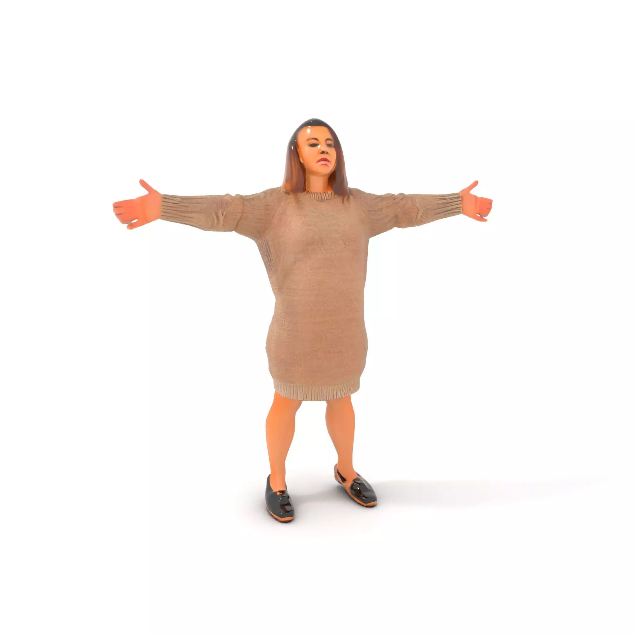 This 3D model pack features a cozy beige sweater dress, perfect for creating realistic character designs or fashion visualizations. Each model has 3 levels of detail: low-poly (1000 triangles for mobile), middle-poly (10,000 triangles for environment), and high-poly (100,000 triangles), which allows for the use of this model in production rendering (such as 3ds Max, Maya, Cinema4D, Blender, Vray/Corona/Cycles and all other), game engines (Unity and Unreal compatible), and interactive presentations, providing a choice of detail based on the LOD System principle. This model is ideal for winter-themed scenes, virtual fashion shows, or character modeling in games. The model's textures are PBR, Diffuse, NormalMap, and reflection/roughness/metallic, which are suitable for any modern rendering engine. All models are accurately unwrapped and have no overlapping UV. Textures are 4096*4096 in size. Please like and leave a comment for the model if you enjoyed it.