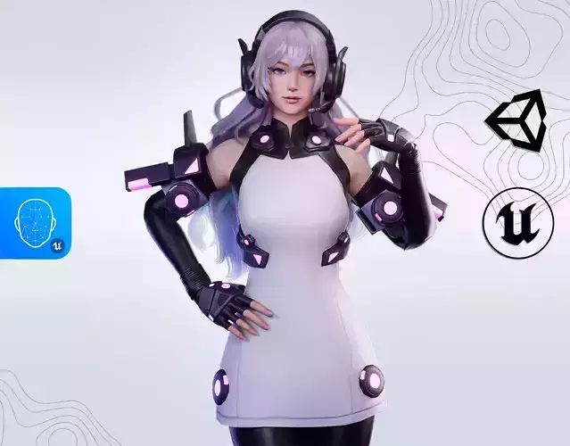 Game-ready girl character with cute sci-fi design. PBR textures, humanoid rig.Supports ARKit & Built-in/URP/HDRP. Seamless integration + compatibility. UE4 & UE5 projects.