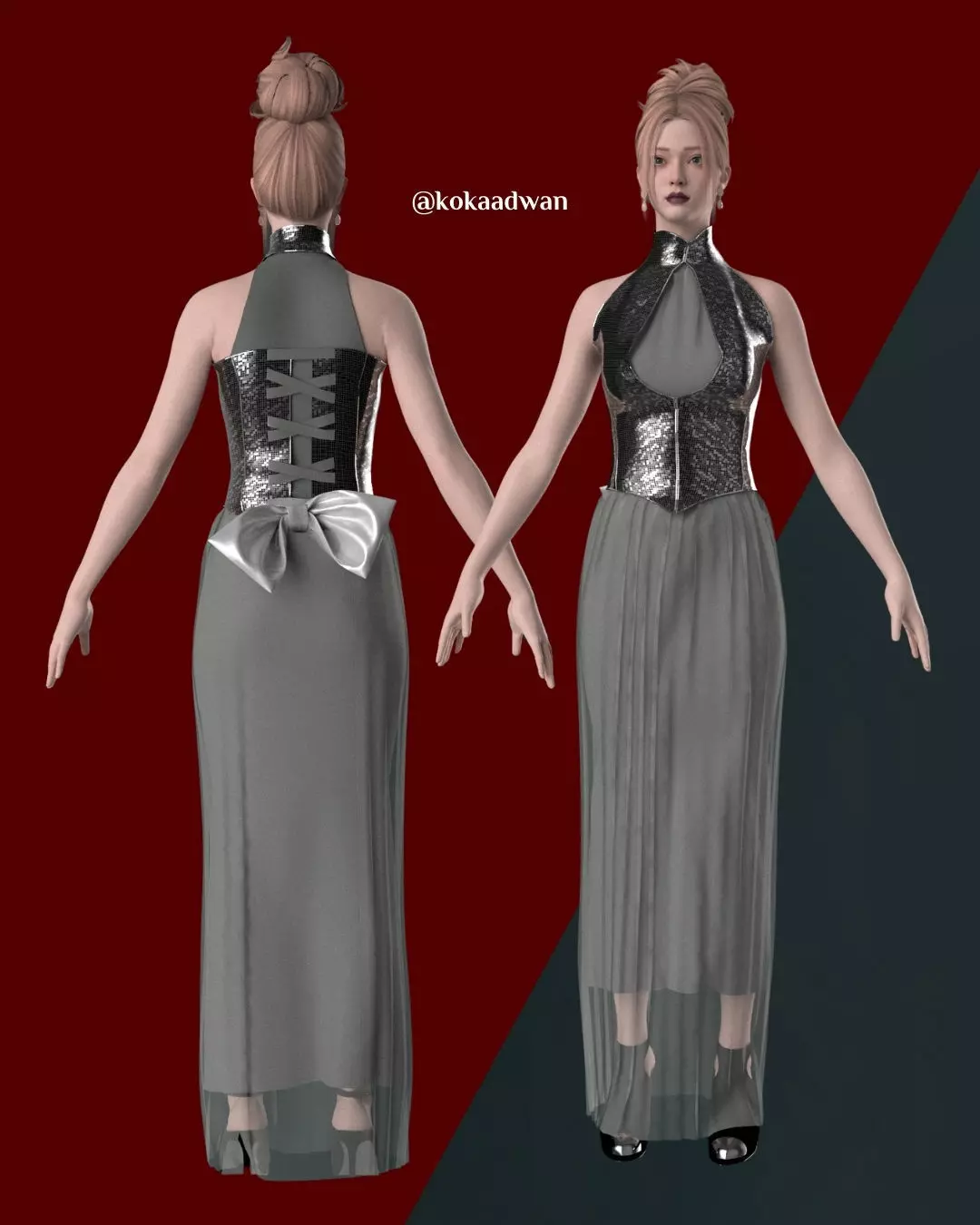 This premium 3D digital garment features an elegant evening dress design with a sequin corset top and a long satin skirt enhanced with a sheer chiffon overlay. The model presents realistic fabric details, lifelike textures, and precise stitching—perfect for fashion visualization, character design, or 3D animation projects.The corset is detailed with sparkling sequin fabric, a lace-up back, and a decorative satin bow for an extra touch of sophistication. The dress is fully optimized for rendering and easy to edit or simulate across various 3D software platforms.
