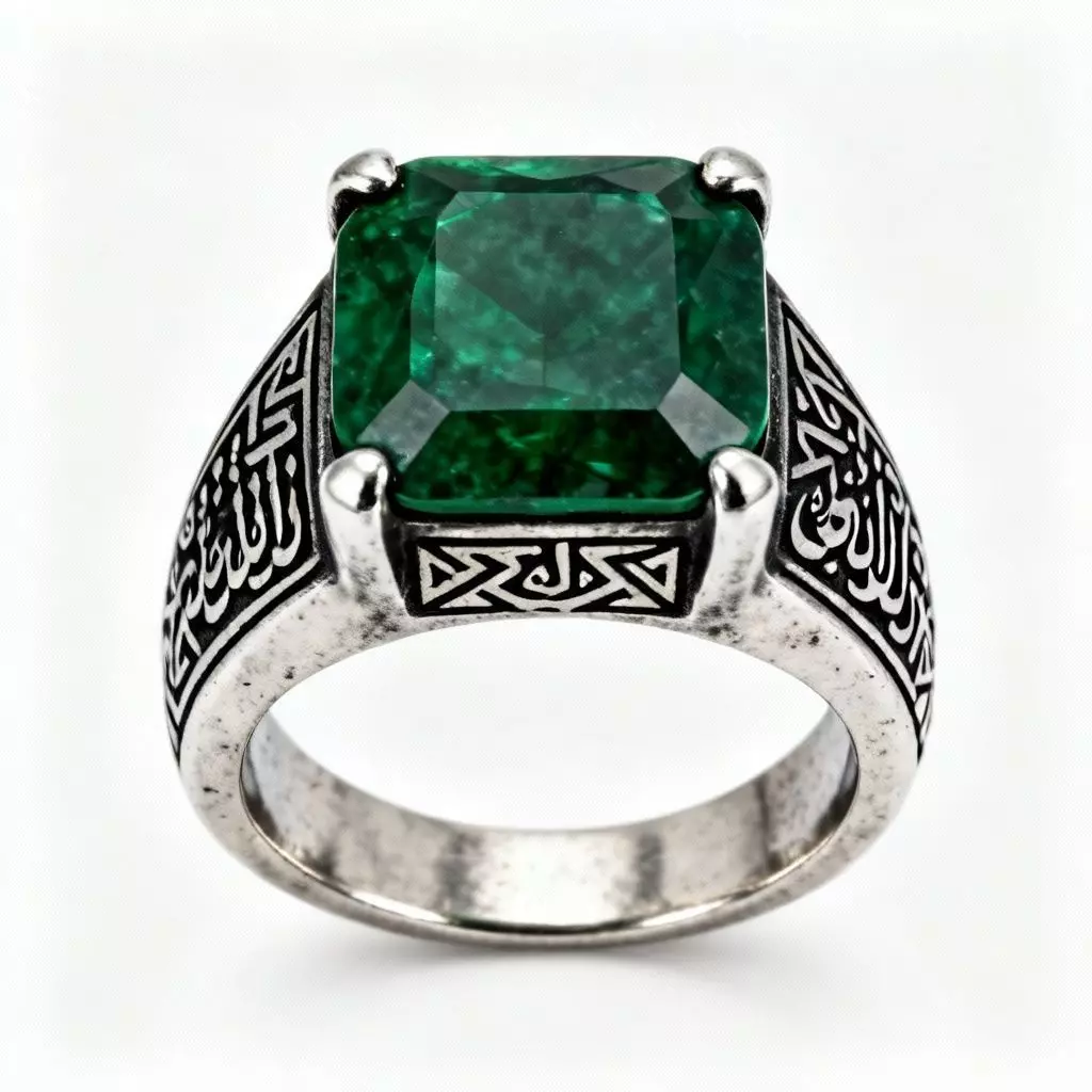 Square-Cut Emerald The centerpiece is a massive, square-cut emerald. Unlike the smooth oval of the previous ring, this one has sharp, faceted edges that catch the light. The stone features internal textures (inclusions), making it look like a real, natural gemstone rather than green glass.