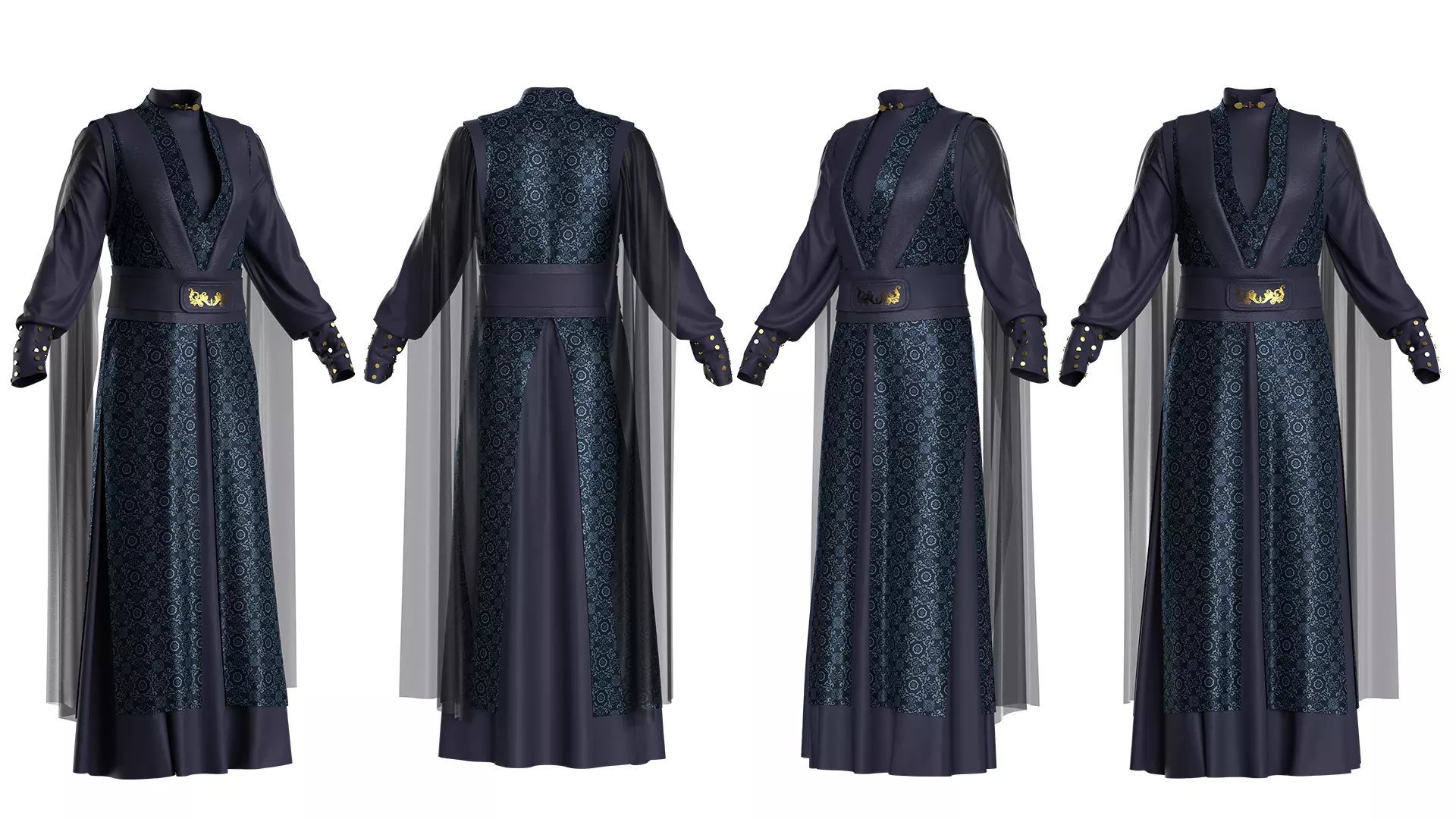 3D Artist: Zeinab Dahgani A dark royal robe with elegant blue patterned fabric, golden accents, and a noble silhouette — perfect for fantasy or historical male characters.