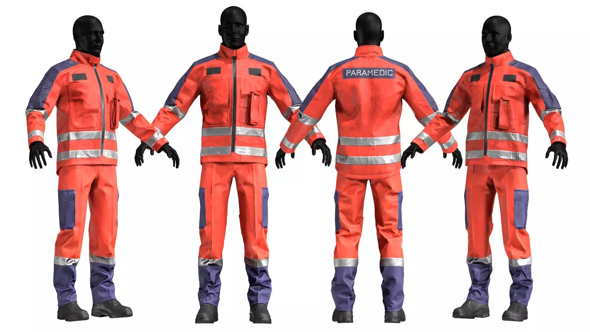 Game-Ready 3D Model inspired by various Emergency Medical Systems (EMS) uniforms. This product includes an EMS Jacket, Pants, and Boots, available in two different colors (orange and black). You can also find the jacket in two variants, one closed and one slightly open with a white shirt underneath.