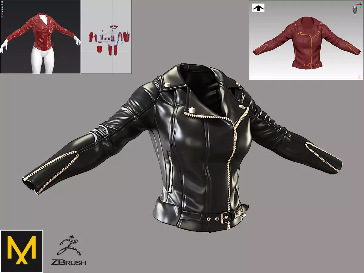 Good day!Let me introduce: Female version of a leather jacket.Available files:3D max file with customized scene for previewHigh poly mesh in ZbrashFile Marvelous designer 9FbxOBJ double-sided high poly modelOBJ with avatar and UVW map