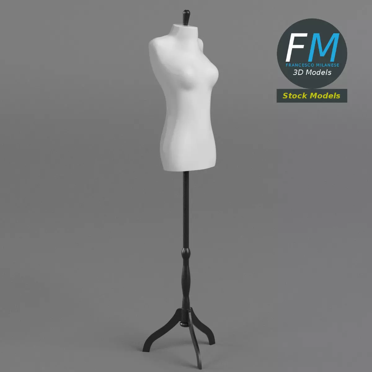 Female mannequin on stand 3D Model. 2 objects (mannequin, stand), parented, each one with its own non overlapping UV Layout map. Production-ready 3D Model, with PBR materials, textures, non overlapping UV Layout map provided in the package.