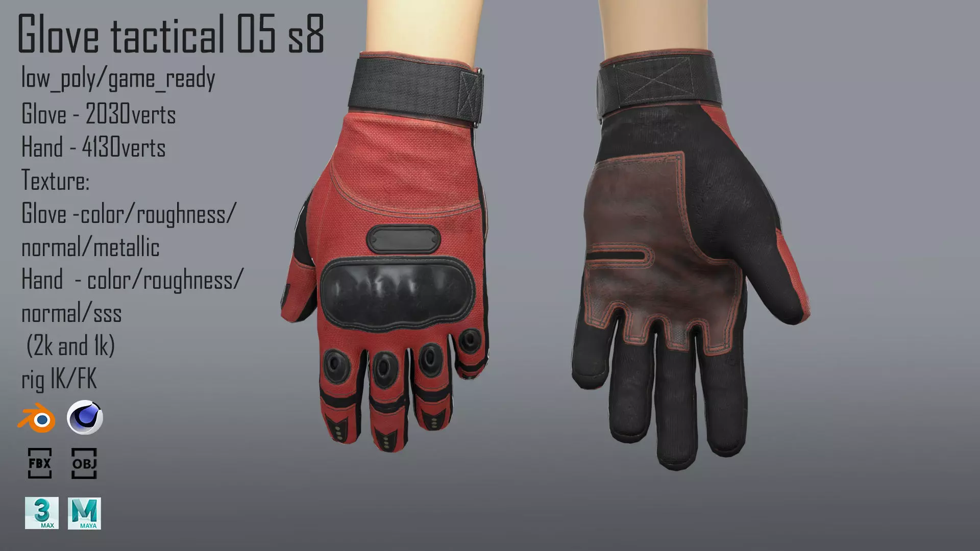 Texture: Glove -color/roughness/normal/metallic (2k and 1k) Hand - color/roughness/normal/sss (2k and 1k)