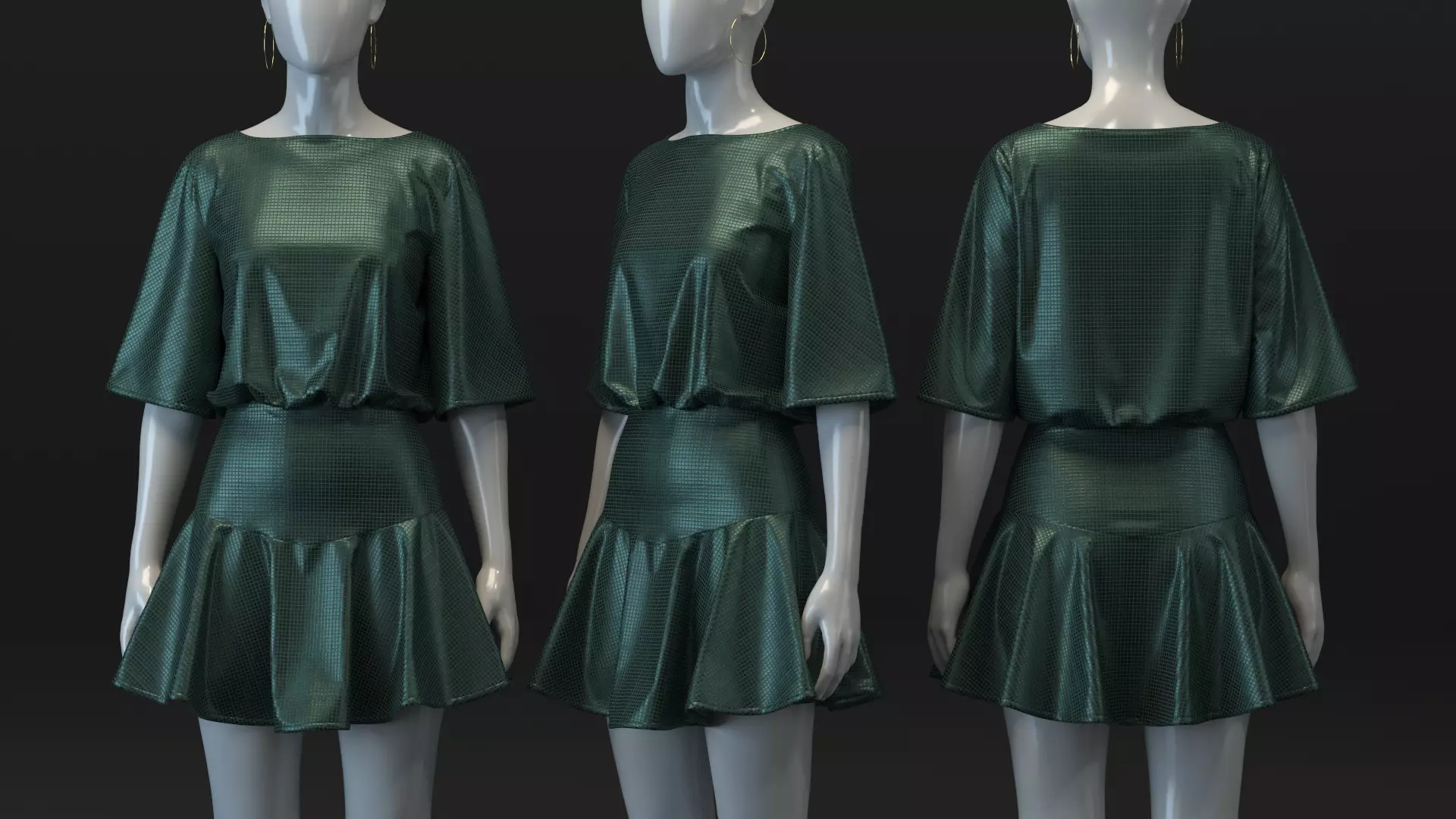 DESIGN DETAILS• Main Fabric: ITY Matte Jersey (VMOD Library)• Neckline: Bateau• Sleeve: Dropped sleeve; Half; bell• Silhouette: A-line; Fitted waist• Length: Mini. Yoke with circle skirt• Finish: Facing & stitches included for a more realistic look when rendered