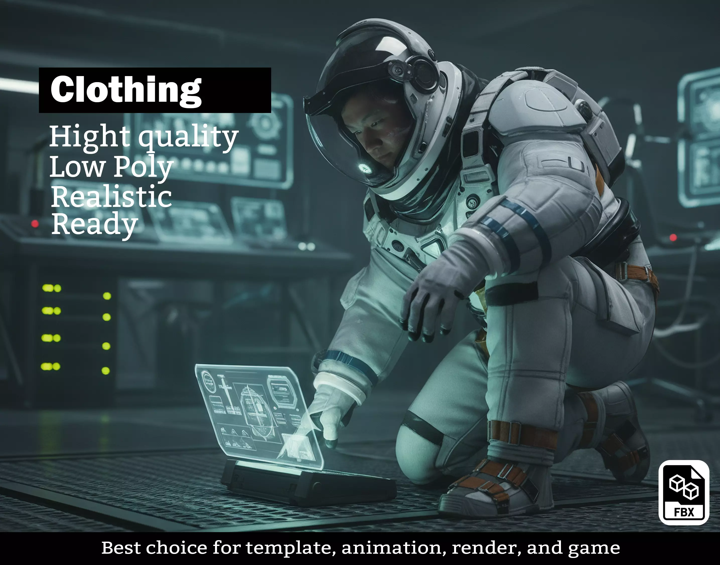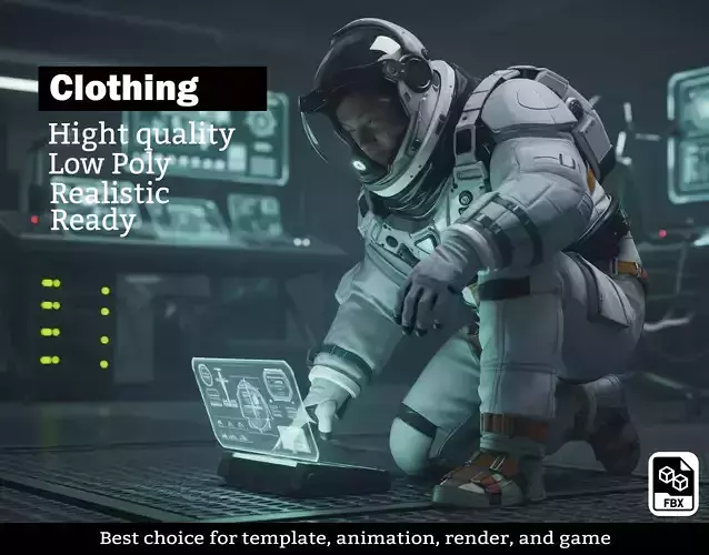Futuristic Design: Features modular armor plates, secure locking mechanisms, and a tactical harness system ideal for near-future or sci-fi settings.Complete Character Asset: Includes the full pressure suit, heavy-duty space boots, gloved hands, and a detailed helmet with a dark visor.Production Ready: Optimized low-poly mesh suitable for real-time rendering in game engines like Unreal Engine 5 and Unity.PBR Texturing: Realistic materials for fabric, metal, and glass elements.