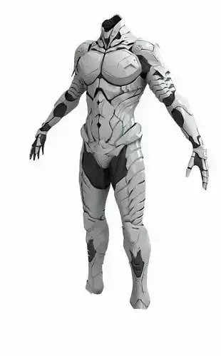 This striking 3D render showcases a sleek, headless futuristic armor suit, designed for maximum visual impact and technical precision. The suit is sculpted from glossy white composite plating, featuring intricate geometric paneling, segmented joints, and layered plating that hugs the muscular contours of the humanoid form. Contrasting black accents — including mesh textures on the shoulders, chest, thighs, and gloves — add depth, functionality, and a touch of tactical realism. The armor’s design blends organic curves with hard-edged mechanical lines, evoking a sense of advanced biomechanics and alien technology. The absence of a head creates an air of mystery and anonymity — perfect for sci-fi narratives where identity is hidden or irrelevant.