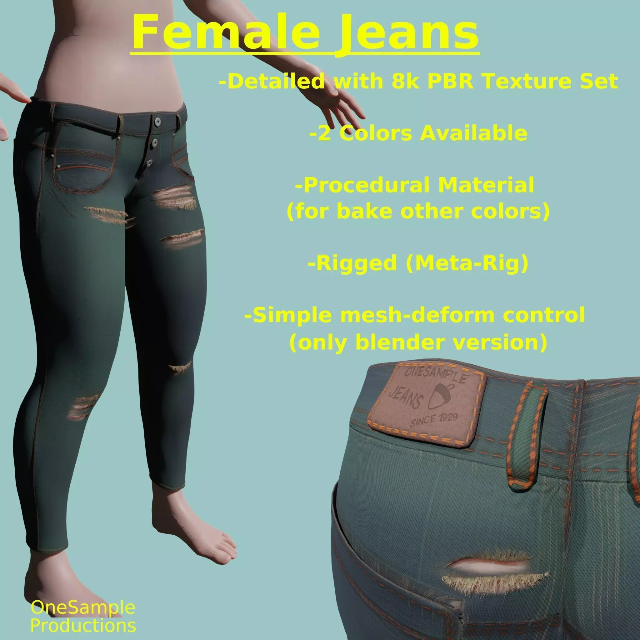 Also included: hipoly meshes of all the objects (Jeans, straps, buttons,sticker), a dummy manequin for viewing pourposes
