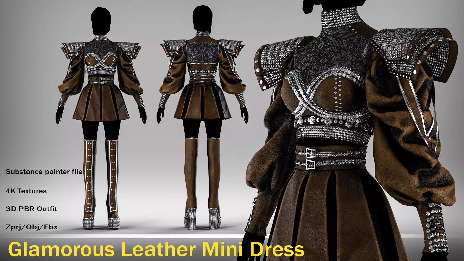 Presenting a Glamorous 3D Mini Dress and Boot Set, perfect for high-fashion renders, fantasy games, or digital art projects. This high-poly outfit features a striking silhouette with elaborate detailing, contrasting leather and decorative metallic/lace textures, and dramatic puffed sleeves.