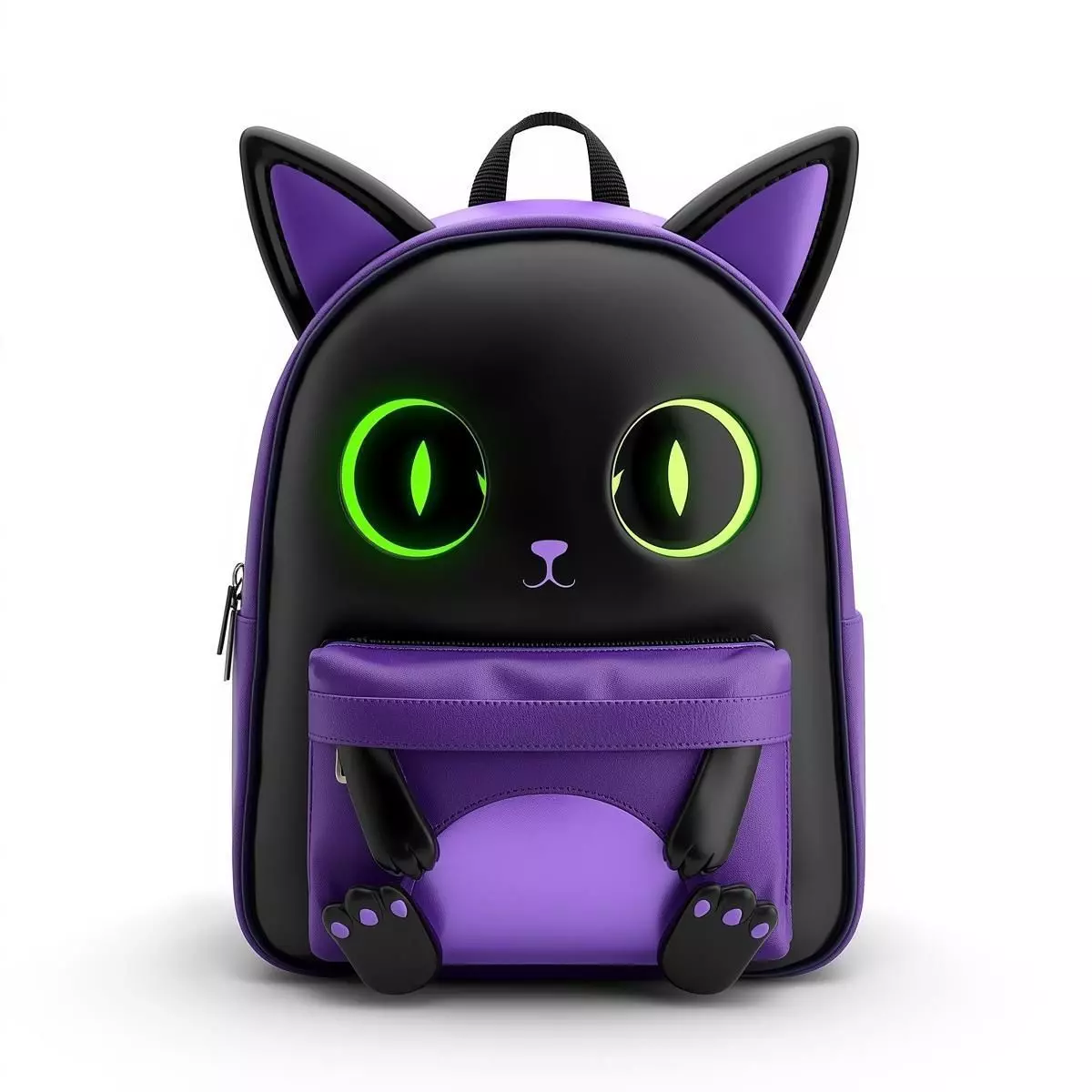 Unique cat-themed backpack with glowing green eyes and purple accents.Sleek black design with playful paws and ears.Perfect for kids, fashion, Halloween, and gaming themes.Includes OBJ, FBX, and GLB file formats.Clean mesh and high-quality, charming details.Great for fashion brands, holiday projects, and creative displays.20 One-Word Tags: