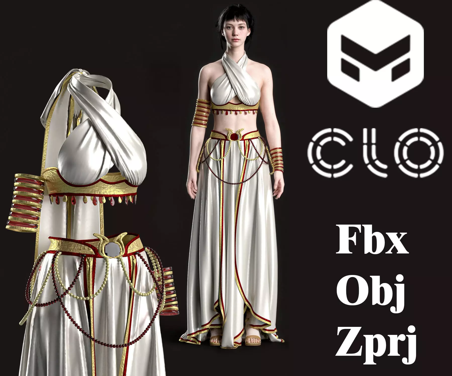 Step into the timeless beauty of ancient Egypt with “Golden Oasis,” a high-quality 3D garment that embodies the richness, symbolism, and aesthetic harmony of one of the world’s most iconic civilizations. This elegant digital outfit was entirely designed, textured, and rendered in CLO 3D, and is now available as a versatile asset for digital fashion creators, character artists, animators, and virtual stylists.