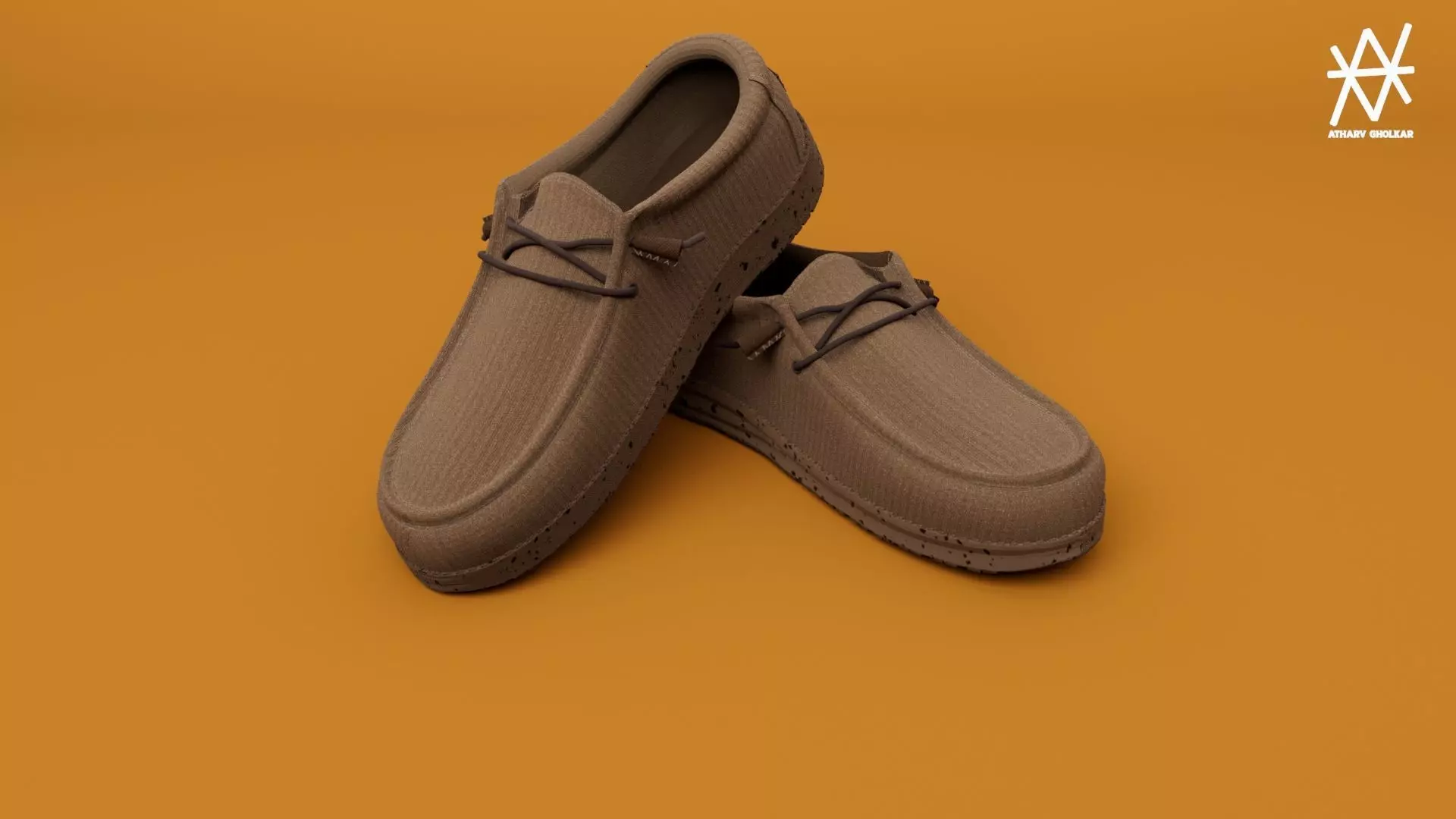 Hey Dude Men's Shoes: A high-quality 3D model with approximately 170K polys, modeled in Maya, textured in Substance Painter, and rendered in Arnold. Featuring detailed craftsmanship and realistic textures, this model is perfect for visual projects and animations requiring lifelike footwear representations."