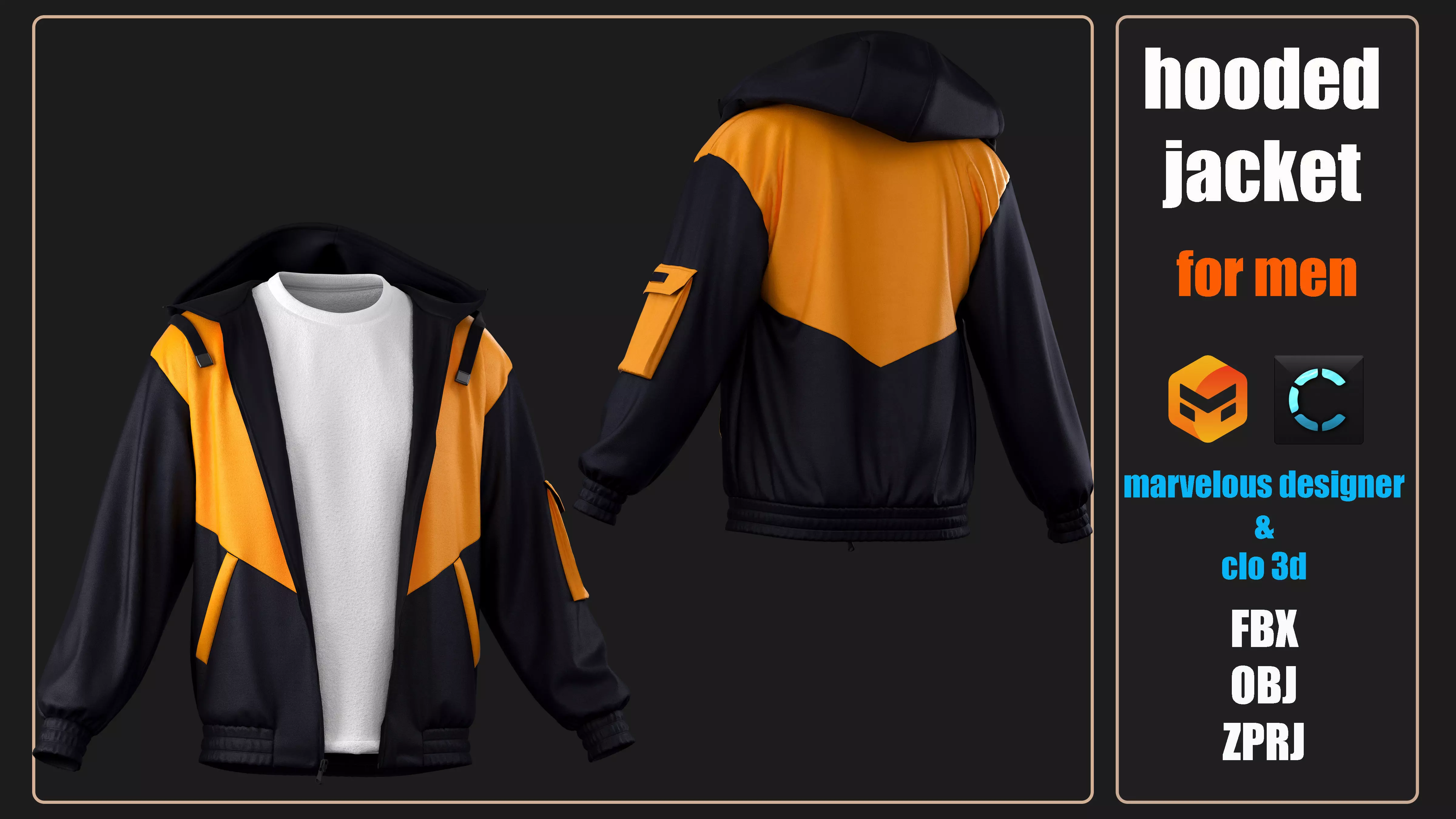 DescriptionThe hooded jacket is for men and set includes 2 pieces of clothes jacket /Tshirt 0 - 100 made in marvelous designer / CLO 3D included zprj fbx obj fills