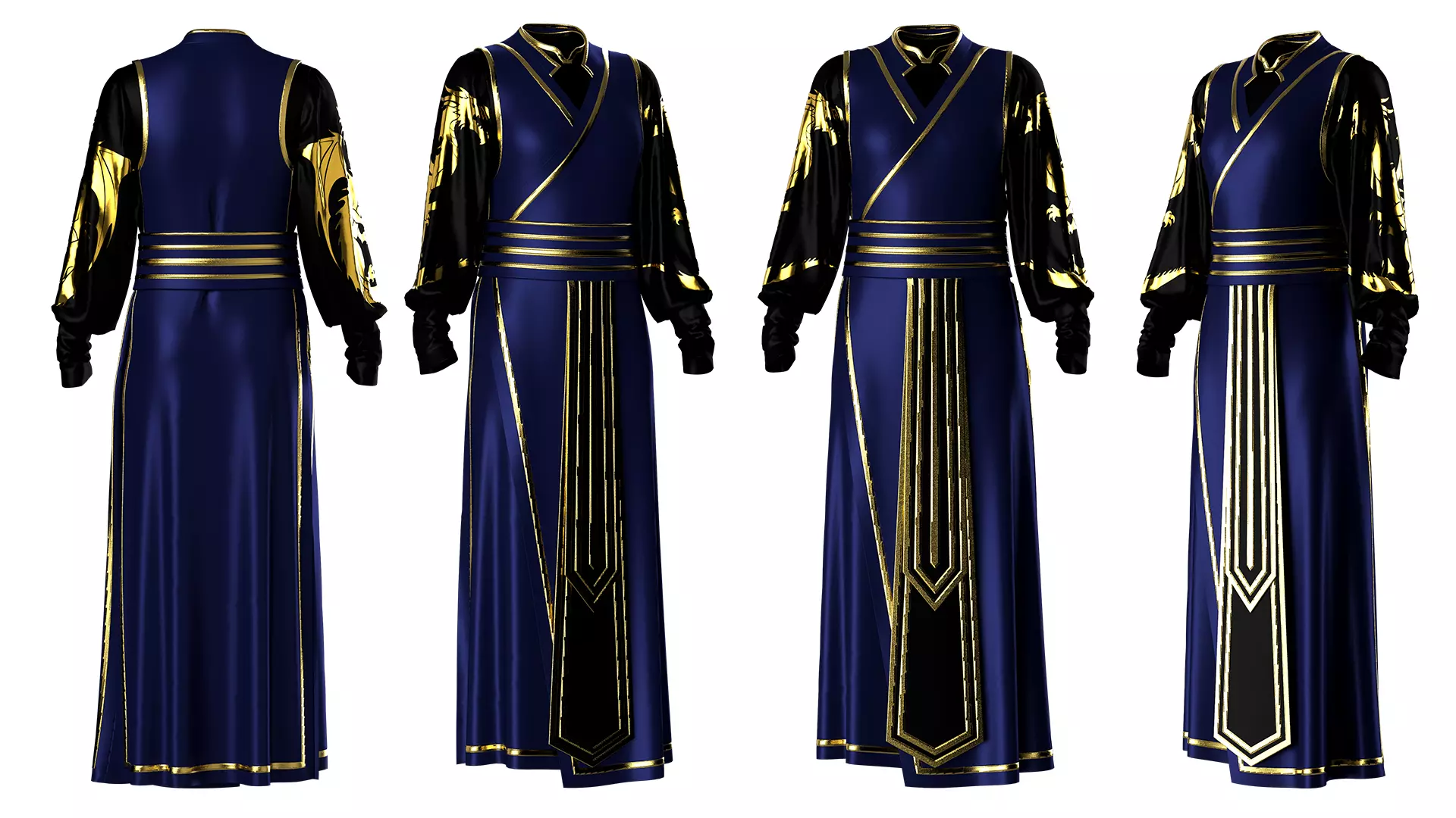 A royal blue and gold robe inspired by fantasy and ceremonial fashion. The elegant design features metallic gold details and flowing fabric, perfect for game characters, cinematic scenes, or digital fashion showcases.