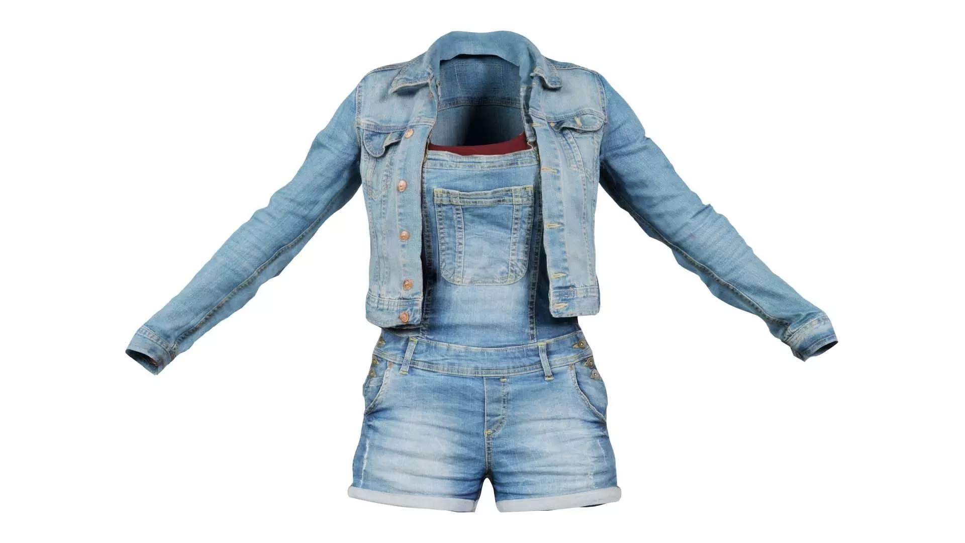This model, jeans ensemble, has been created using photogrammetry from a real world object. It is featuring denim jumpsuit and overalls.The 3D Model is part of the Polygonal Miniatures Remastered collection, which has been optimized with better shaders, correct scaling (meters) and centered position.We use multi camera capturing in the 3D scanning process. The scan data is cleaned and processed in Zbrush and Photoshop. In the end, the low poly product contains unwrapped UV's, textures and normals maps. Detailed specifications can be found below: