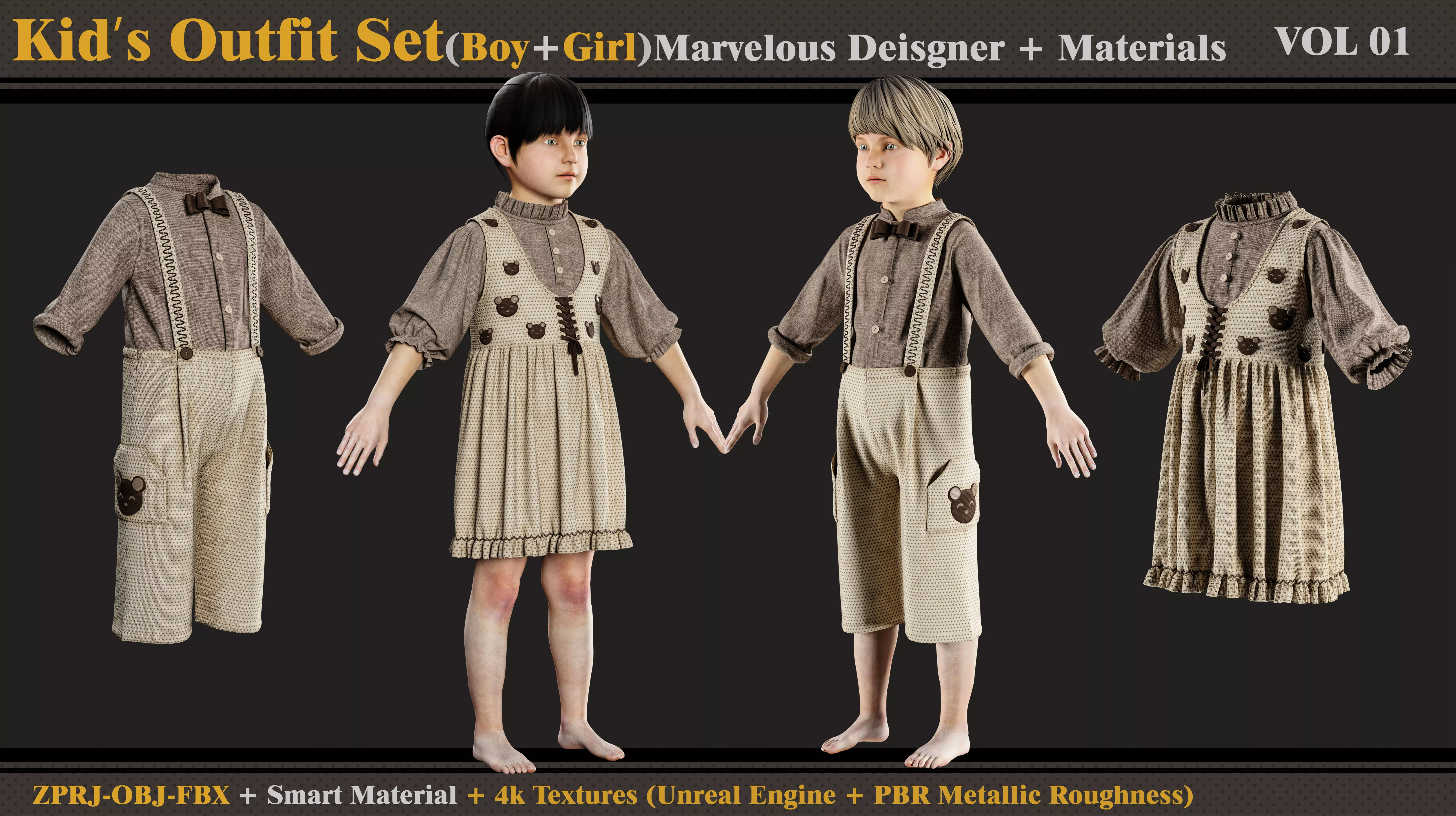 Kids Outfit Set-BOY -GIRL- MD-Clo3d-Material- Textures-OBJ-FBX 3D model