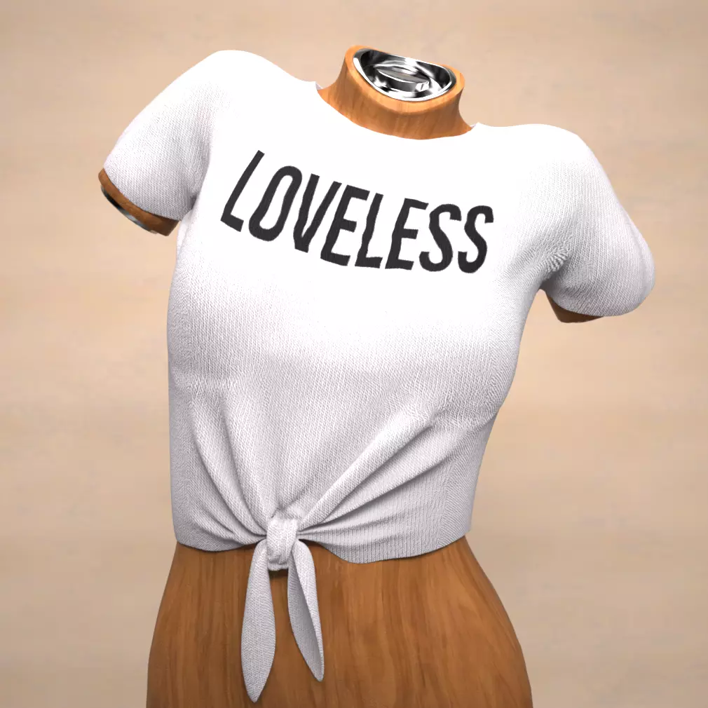 The shirt comes in 8 different colors (Azure, Black, Blue, Default White, Gray, Green, Peach, and Red), which can be found in the Material subfolder. To ensure the design always pops, the LOVELESS text automatically swaps colors based on the fabric: dark fabrics feature a white print, while light fabrics feature a black print.