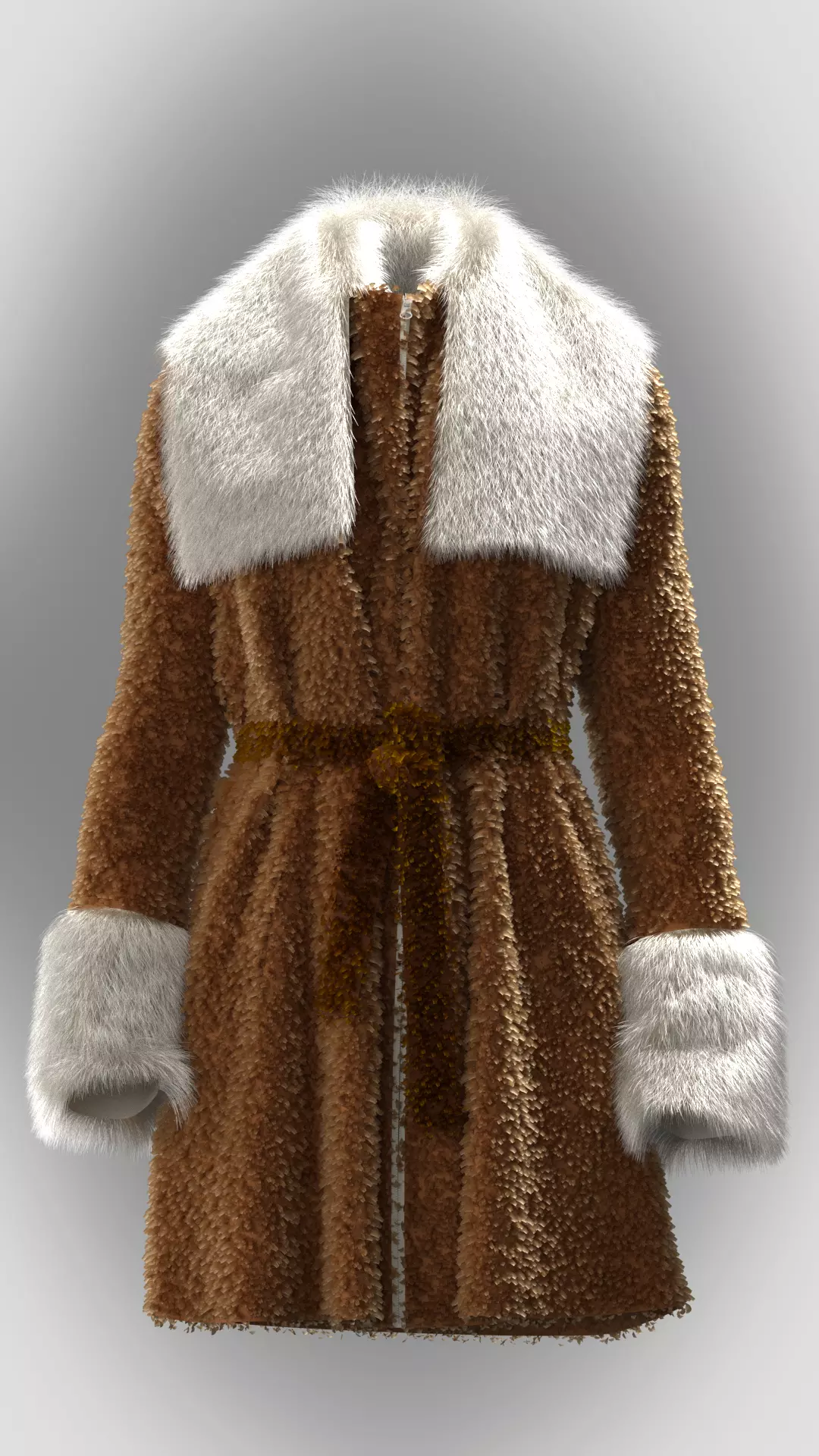 Ladies shearling coat. Very High Quality Rendered. Made By Clo Standlone. This model has a low polycount . Includes various formats with realistic effect textures and normal map. Ready Pattern for make actual product.** Provided File Formates are Dxf,OBJ, FBX, Zprj, AI, Gltf, xml, mcx . Let me know if any support required in comment box.