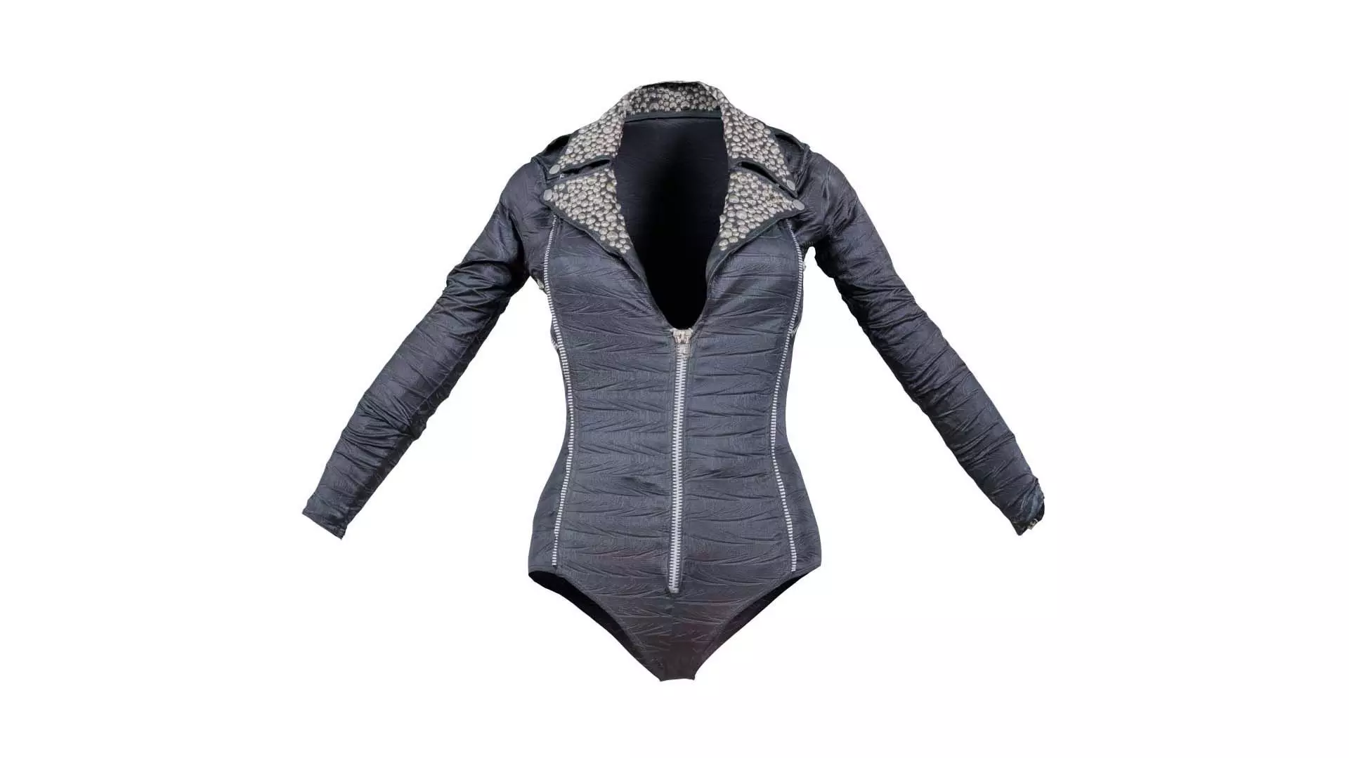 3D scanned model featuring a womens bodysuit with a zipper and collar. This model, leather body, has been created using photogrammetry from a real world object.The raw scan data has been cleaned, retopologized and UV-unwrapped using Zbrush. The result is a low poly mesh with baked maps. The .obj and .mtl are configured so that maps will load automatically in the shader (tested in Blender). In addition, a Blender scene is provided with the model and shader already set up for rendering and export. Detailed information below: