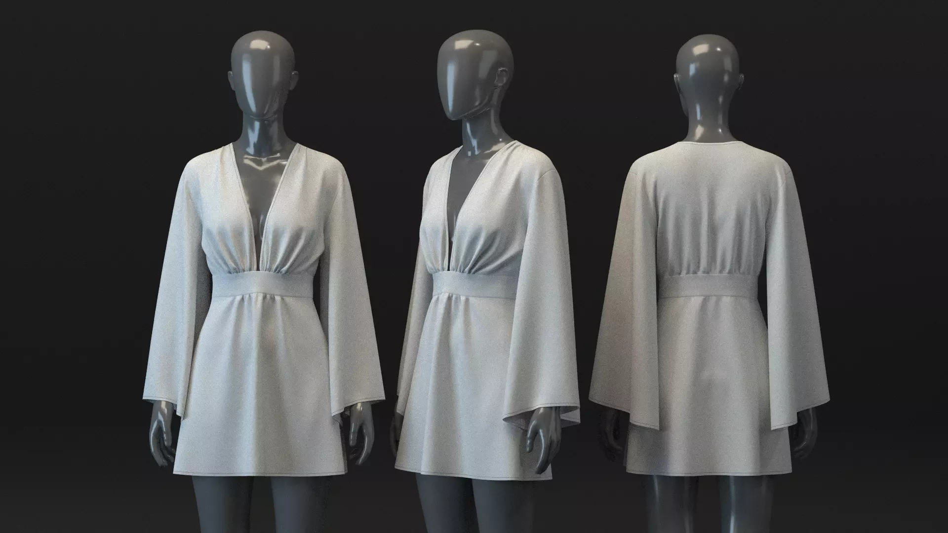 DESIGN DETAILS• Main Fabric: Challis (VMOD Library)• Neckline: Deep-V• Silhouette: Fitted & Flare; Ruched front detail• Sleeves: Bell• Length: Mini; A-line• Finish: Facing & stitches included for a more realistic look when rendered