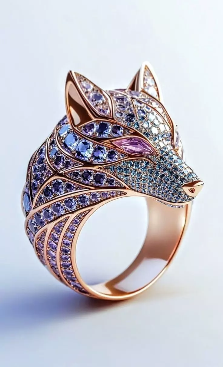 Ultra-realistic 3D model of a luxury fox ring, designed as a powerful and elegant digital asset that blends advanced craftsmanship with natural form. The figure features a sleek, streamlined body rendered in smooth, glossy rose gold material—resembling polished metal or composite resin—with contrasting blue and purple gemstones that highlight its robotic nature. Its head is elongated and angular, with glowing pink eyes that add a touch of life and intelligence to its expression.