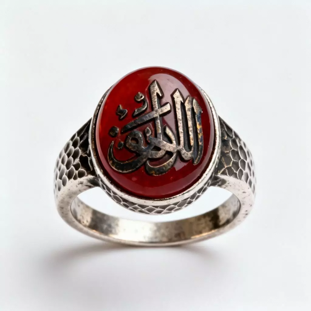 Inlaid Silver Calligraphy Embedded directly into the red stone is an intricate piece of Arabic calligraphy made of silver. This inlay technique gives the ring a prestigious and custom-crafted look, suggesting it bears a holy name or a royal seal.
