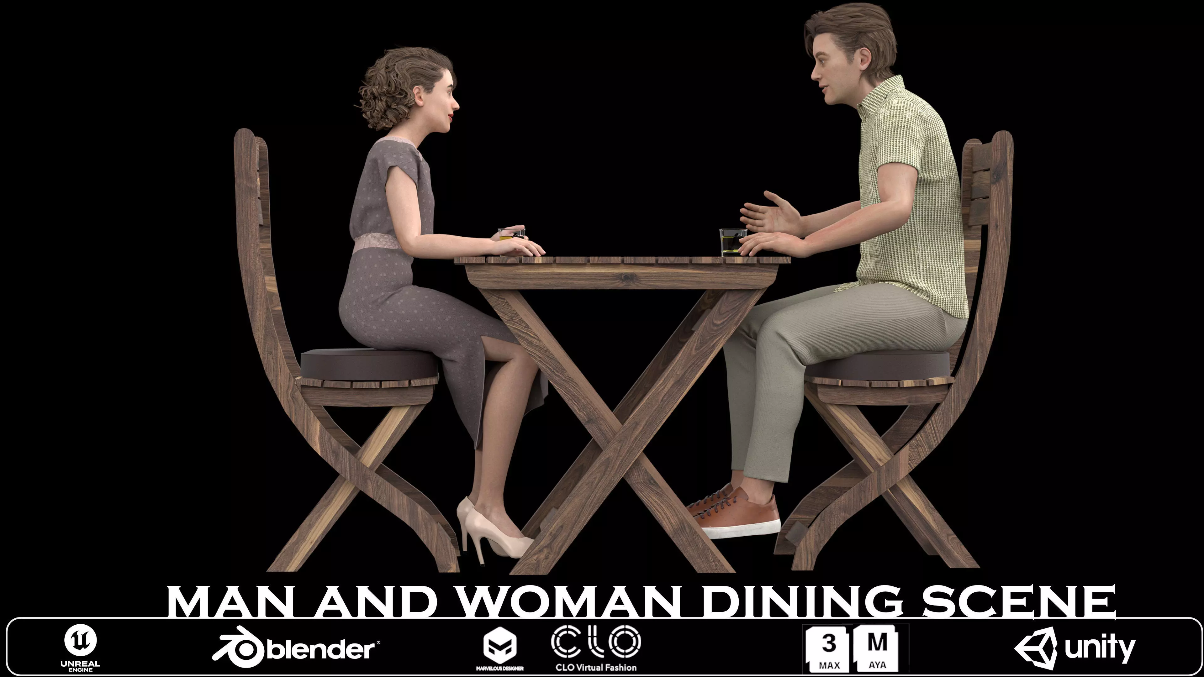 Name: man and woman dining sceneType: modelFormat: 3Ds Max 2013Export: FBX, OBJRender: VRay (5.x), Corona (6)Polys: 252912Verts: 322672Matclasses: Multimaterial,VRayMtl,CoronaMtlUnits: CentimetersDimension: 206.68 x 77.17 x 154.79Date: 2025.8.26This sophisticated 3D dining scene features two realistic characters engaged in an intimate conversation at a beautifully crafted wooden table. The scene includes a professionally dressed woman in an elegant gray dress and high heels, and a man in a contemporary checkered shirt and chinos, both positioned naturally with drinks in hand. The rustic wooden furniture set showcases detailed wood grain textures and traditional cross-leg design, creating an authentic restaurant or home dining atmosphere perfect for lifestyle and hospitality visualizations.The complete scene package includes fully rigged characters with natural poses, detailed facial features, and contemporary clothing with realistic fabric textures. The wooden table and chairs feature high-quality materials with accurate wood grain patterns and warm, natural lighting. This ready-to-use asset is optimized for architectural visualization, restaurant marketing, lifestyle applications, dating apps, and social simulation games. Compatible with major 3D software and game engines, the scene offers excellent versatility for both close-up character interaction shots and wide environmental renders.