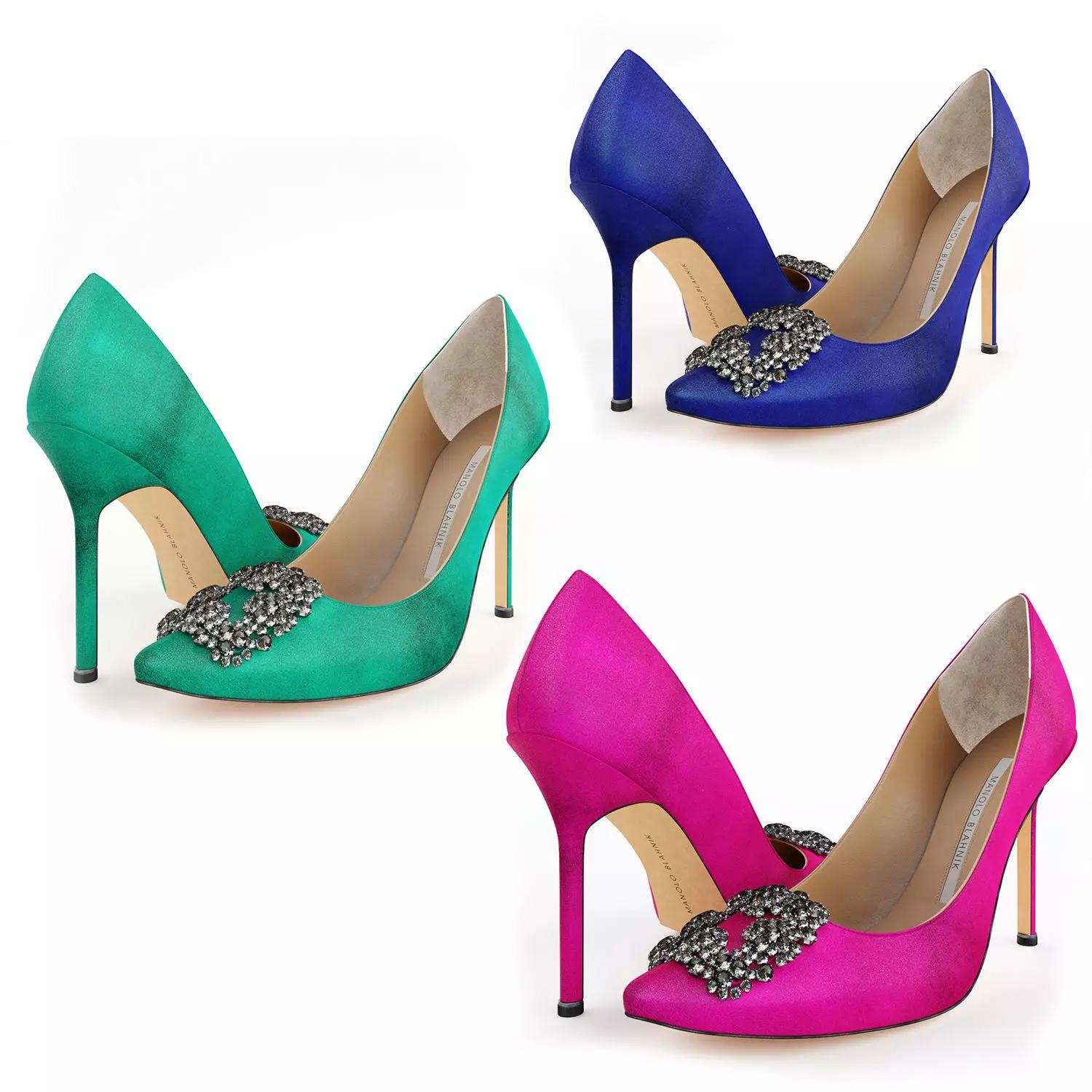 3 Pairs of Manolo Blahnik Hangisi Satin Jewel Buckle 105mm pumps in green, blue and pink satin.