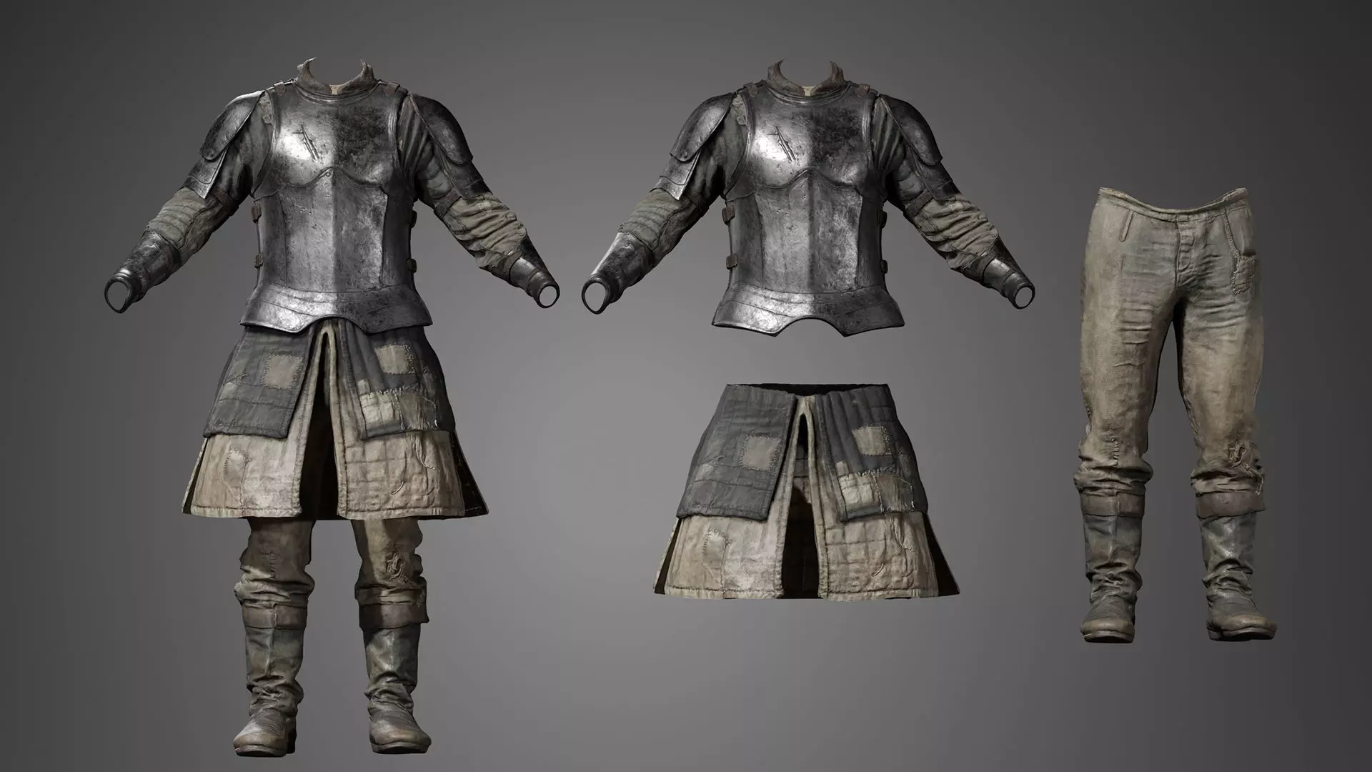 This set features a heavy infantry outfit, including a forged steel breastplate with integrated pauldrons (shoulders) and bracers, a thick linen gambeson, multi-layered quilted faulds, and rugged trousers with heavy leather boots. These assets are ideal for knights, veteran soldiers, RPG environments, or character dressing scenes. The clothing features realistic textures of cold-rolled steel with battle scuffs, patched heavy fabric, and stained linen to provide a powerful, front-line warrior appearance. Perfect for adding high-protection equipment to NPCs and protagonists in game scenes or cinematics.