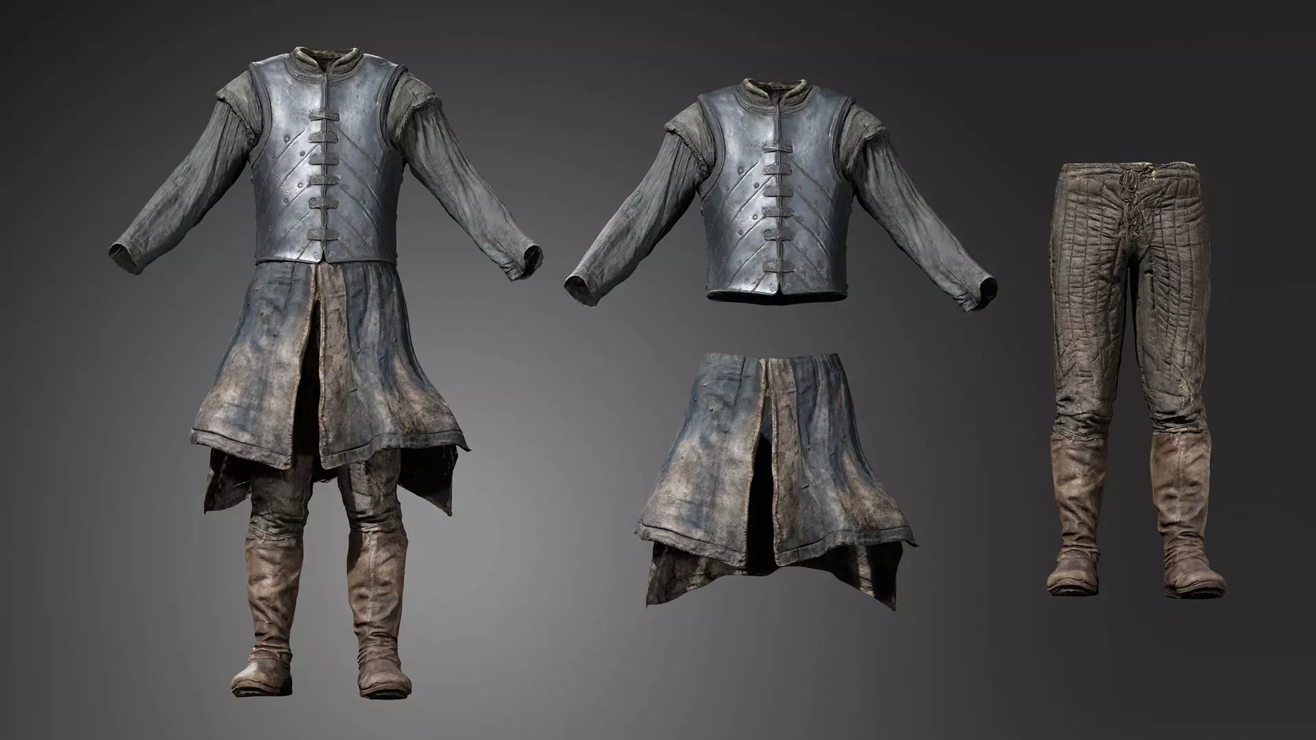 This set features a lighter reinforced outfit, including a Brigandine-style leather vest with metal studding, a long-sleeved linen tunic, protective heavy fabric faulds (skirt), and vertically quilted padded trousers tucked into rugged leather boots. These assets are ideal for archers, scouts, RPG environments, or character dressing scenes. The clothing features realistic textures of dark indigo and grey dyed fabrics, weathered leather, and rusted metal rivets to provide a practical, veteran warrior look. Perfect for adding high-quality character equipment to NPCs and protagonists in game scenes or cinematics.