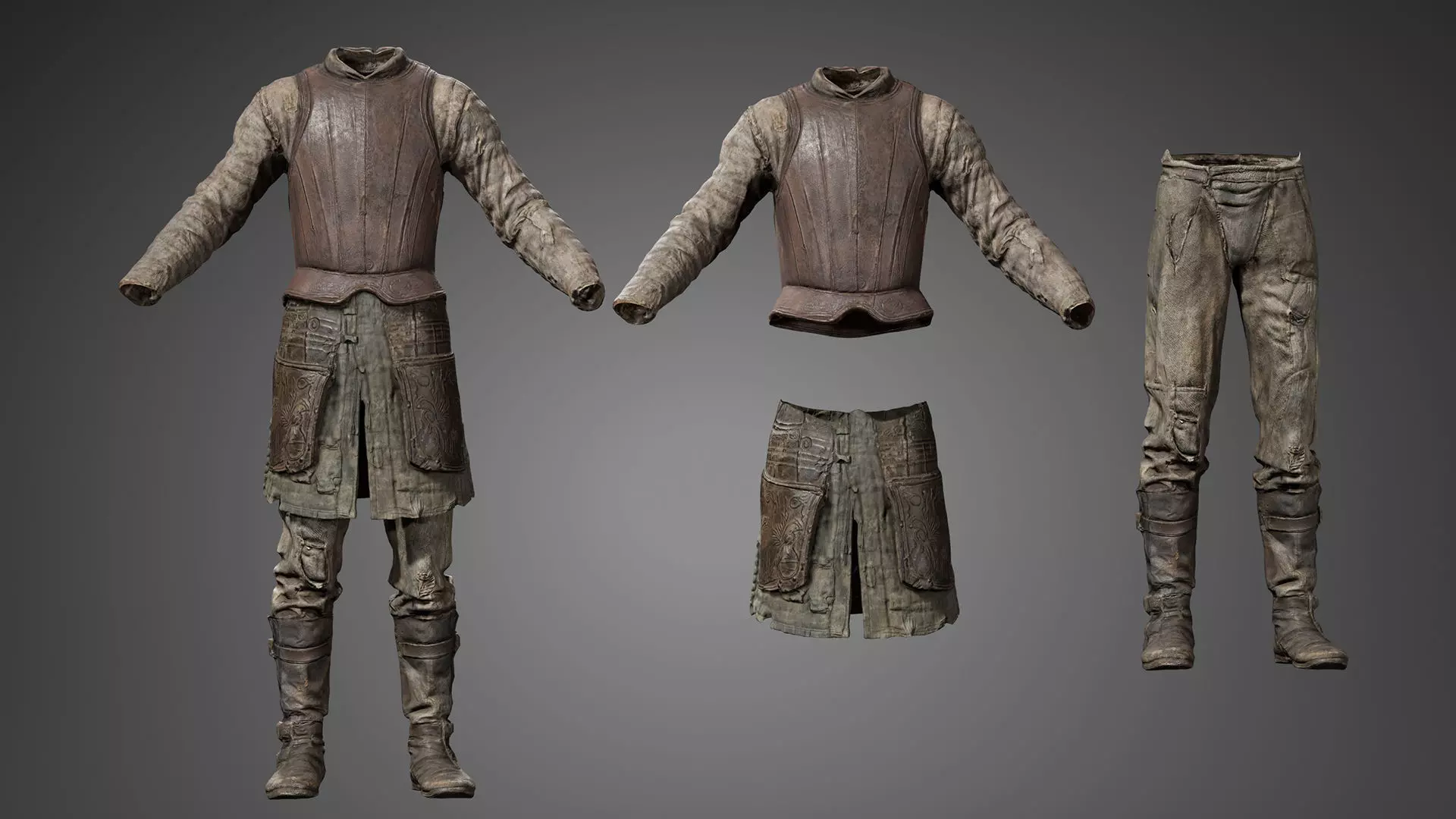 This set includes a complete outfit featuring a gambeson-style undershirt, a reinforced leather cuirass, decorated faulds (skirt armor), and weathered trousers paired with sturdy leather boots. These assets are ideal for medieval villages, RPG environments, fantasy worlds, or character dressing scenes. The clothing features realistic textures of worn linen, patched fabric, and aged, embossed leather to provide a believable, lived-in appearance. Perfect for adding authentic character details to environments or dressing NPCs and protagonists in game scenes or cinematics.