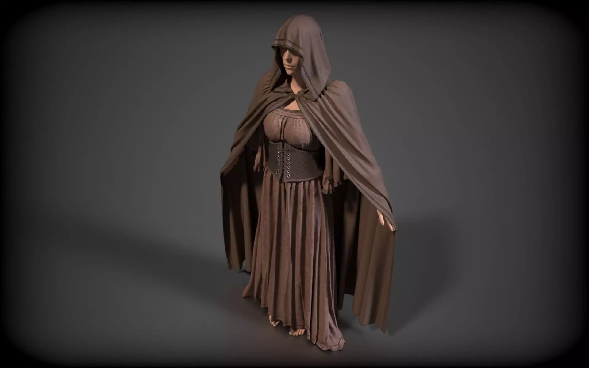 Medieval brown corset dress with cloak. The model is made in marvelous format. Edited in Blender and ZBrush and textured in Substance Painter. Textures included. PBR material configuration(base, normal, roughness, metallic).
