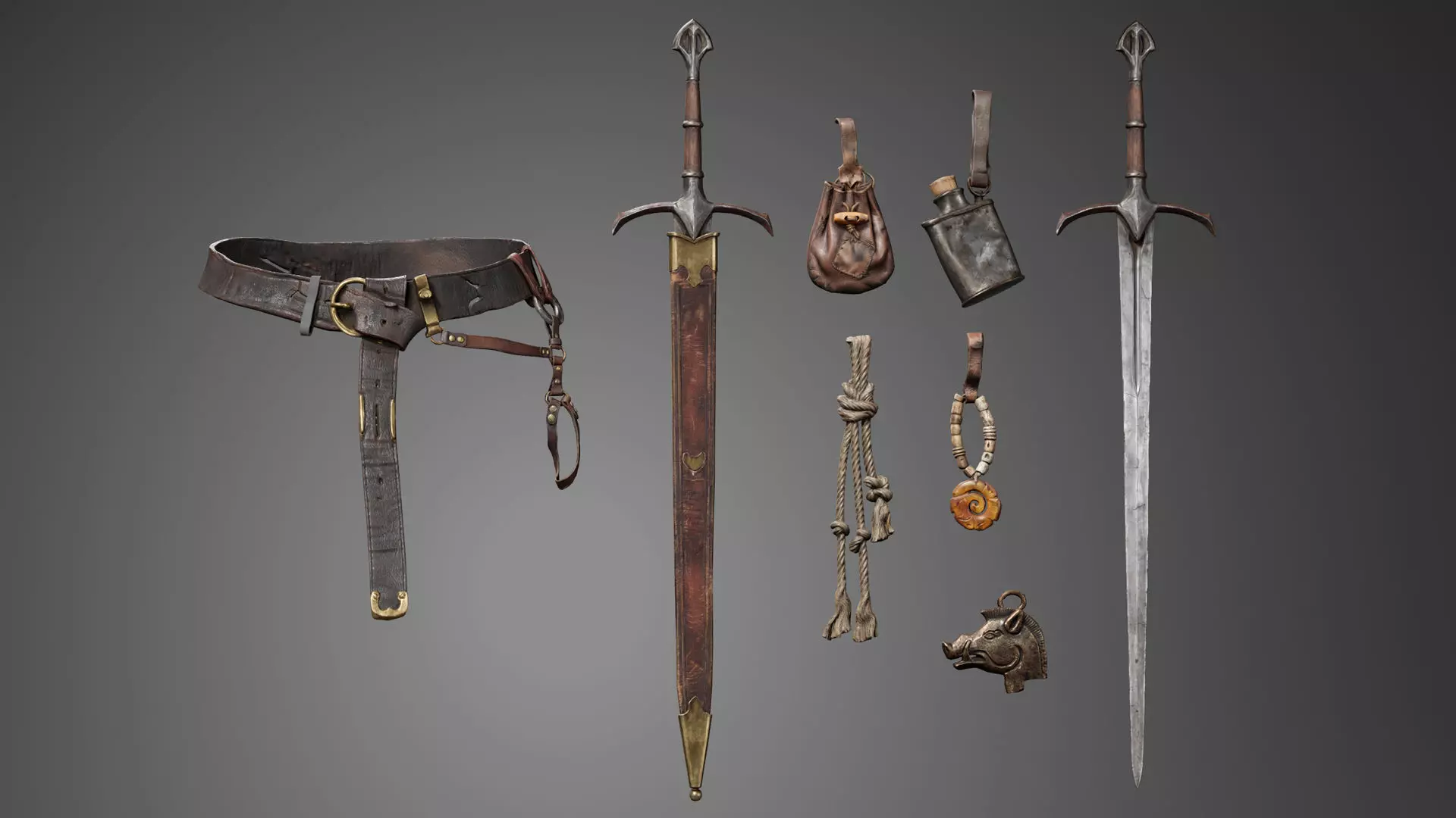 This set includes various character accessories such as a complex leather belt rig, a drawstring pouch, a sleek longsword with a gold-trimmed scabbard, a metal flask, and unique hunter-themed charms. These assets are ideal for medieval villages, RPG environments, fantasy worlds, hunting camps, or character equipment scenes. The props feature polished wood, aged leather, and brass accents to provide a high-quality, professional medieval look. Perfect for adding storytelling details to environments or dressing characters and props in game scenes or cinematics.