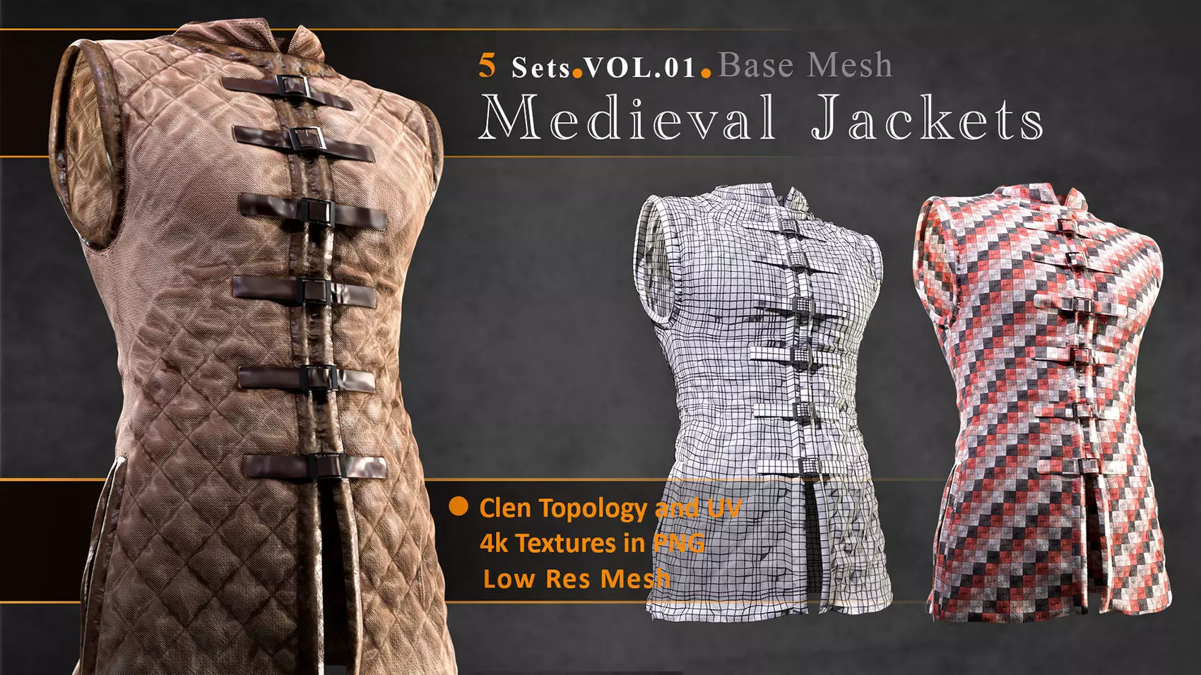 this product contains 5 sets of jackets based on medieval costumes. in this pack you can find low poly base mesh (fbx), Marvelous Designer file (Zprj) and 4K textures (png) for each set.