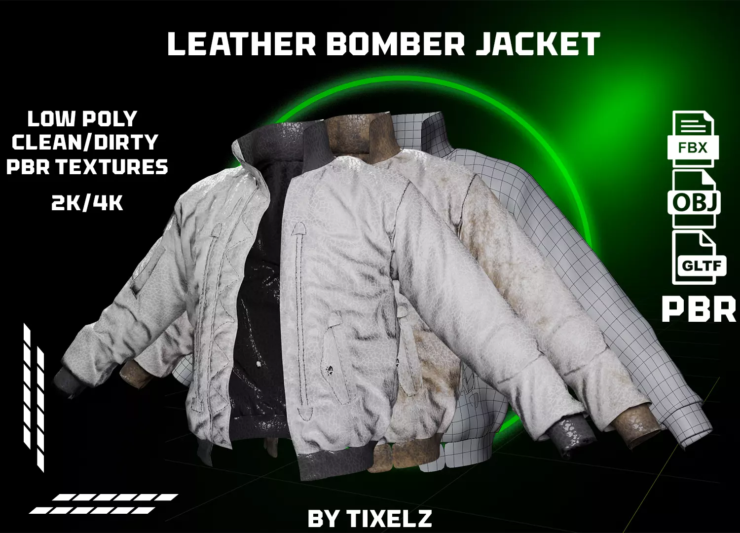 Leather Bomber JacketThis 3D leather bomber jacket features realistic leather detailing and comes with clean and dirty texture variations for maximum versatility—from fresh streetwear looks to rugged, worn-in styles. Built with clean quad topology and subdivision-ready geometry, it deforms smoothly in animation while remaining efficient for real-time use.